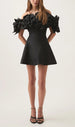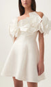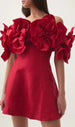 The star of the show? Exquisite. sculptural 3D fabric flowers gracefully adorn the off-shoulder neckline. creating a whimsical yet sophisticated silhouette. Each petal is meticulously crafted. adding an unparalleled dimension and luxury to your look. Made from a premium. structured fabric. this dress promises both comfort and a flattering A-line fit that moves beautifully with you.