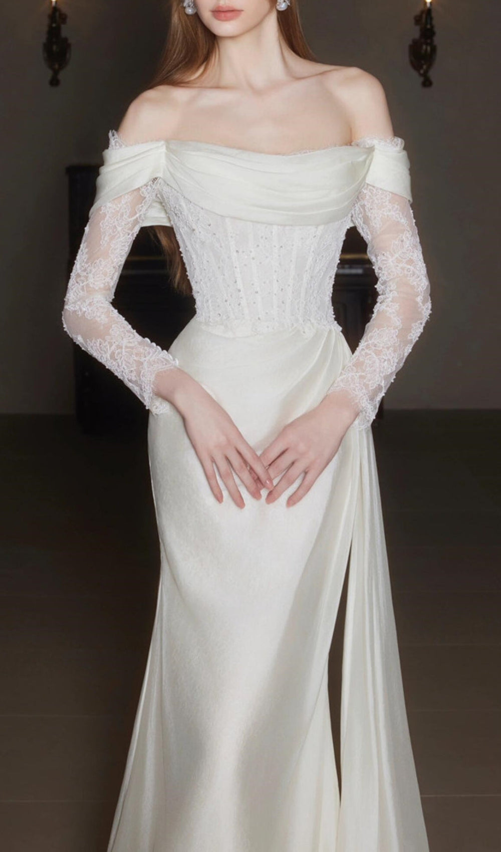 The exquisite off-the-shoulder neckline gracefully frames your colletage. leading to stunning. sheer long lace sleeves adorned with intricate floral patterns and subtle sparkling embellishments. The heart of this gown is its meticulously crafted corset-style bodice. featuring delicate lace overlay. It's engineered to beautifully hug your curves. creating a flattering hourglass figure that will leave everyone captivated.