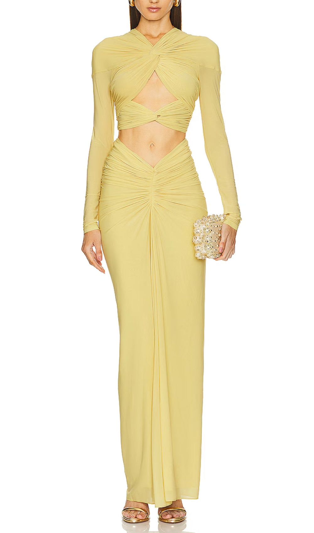 Step into the spotlight and command attention with the exquisite Darby Butter Yellow Twisted Cutout Long Sleeve Maxi Dress. Crafted to flatter. this show-stopping gown is your go-to for making a sophisticated yet daring statement at any exclusive event.