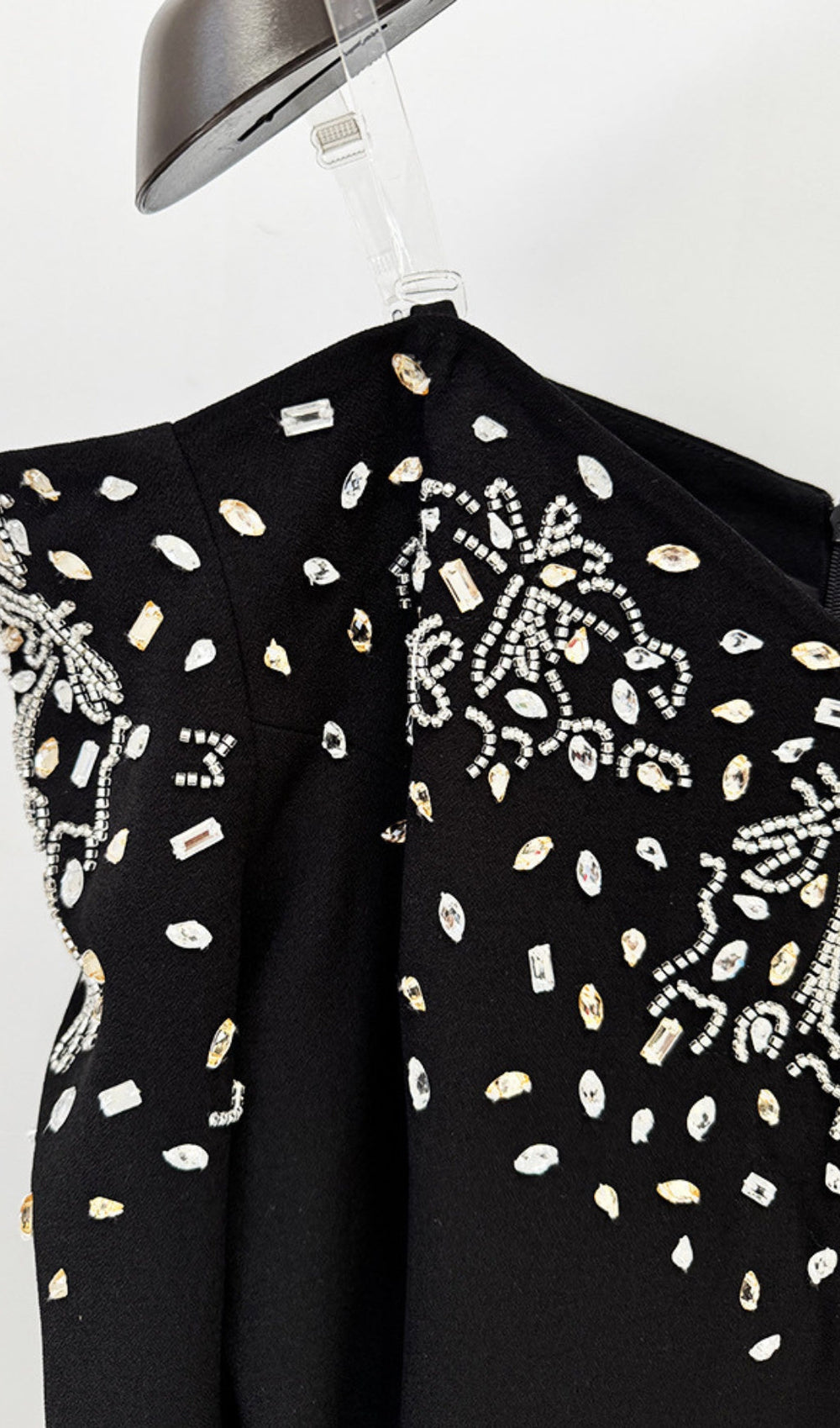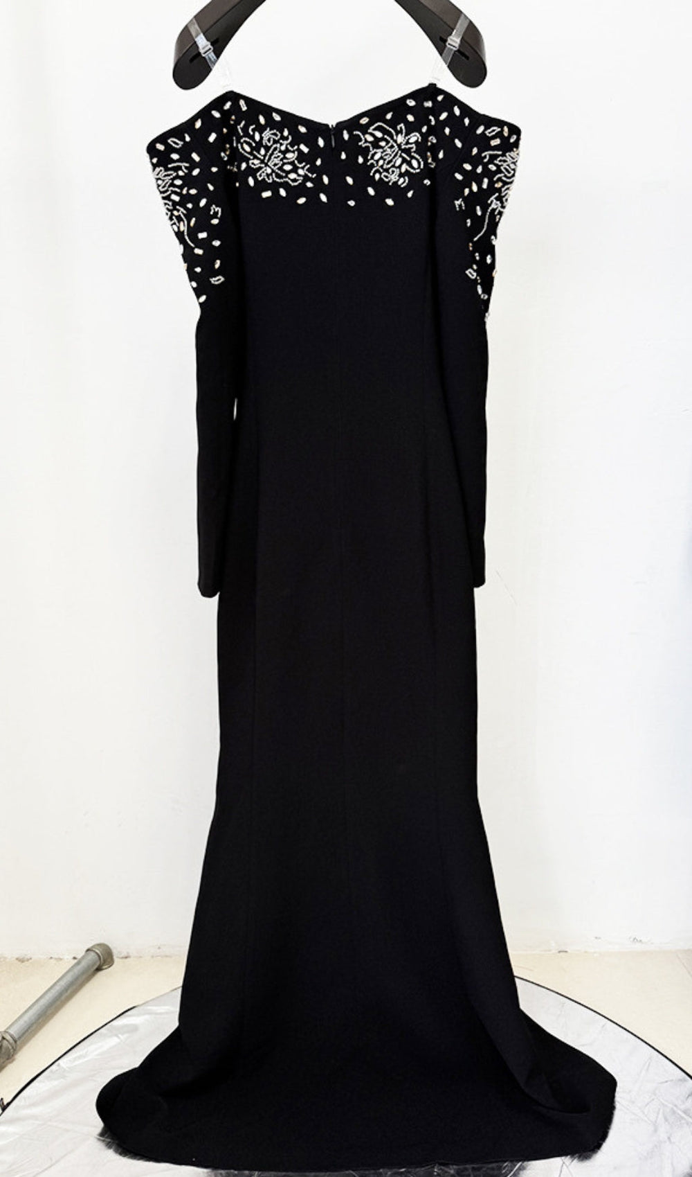 Step into the spotlight and captivate every eye with our exquisite Denita Black Crystal Off-Shoulder Maxi Gown. Designed for the modern American woman who commands attention. this dress is your ticket to an unforgettable evening. Imagine the luxurious feel of the fabric against your skin and the dazzling play of light from the crystals as you glide through the room.