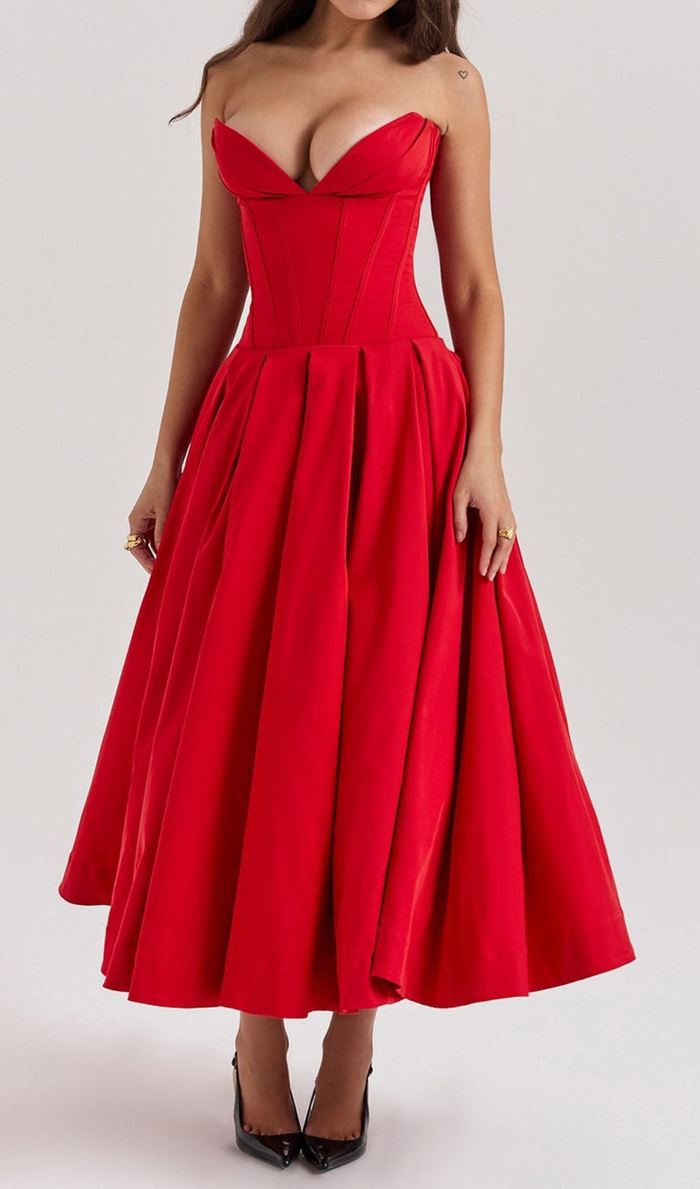 Crafted to perfection. this dress boasts a figure-flattering corset bodice that beautifully accentuates your silhouette. The chic strapless design highlights your colletage. while the structured boning offers exceptional support and a luxurious feel. Its vibrant. unmistakable red hue ensures you'll be the focal point of any gathering. radiating sophistication and passion.
