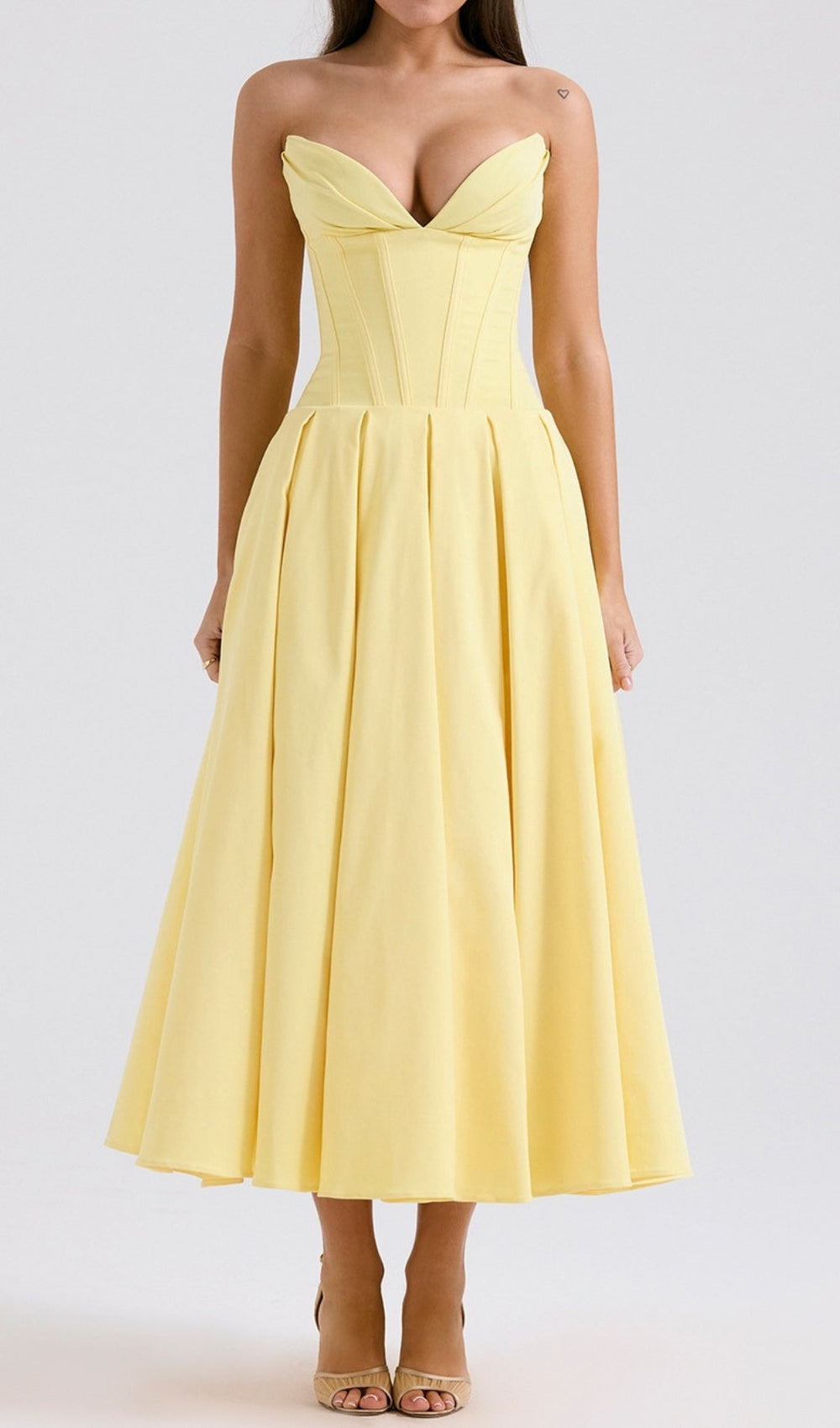 Step into effortless elegance and vibrant charm with our stunning Devani Yellow Strapless Corset Midi Dress. Designed for the modern woman who loves to make a statement. this dress combines classic sophistication with contemporary allure. perfect for your next special occasion. Its captivating yellow hue radiates warmth and confidence. ensuring you stand out beautifully.
