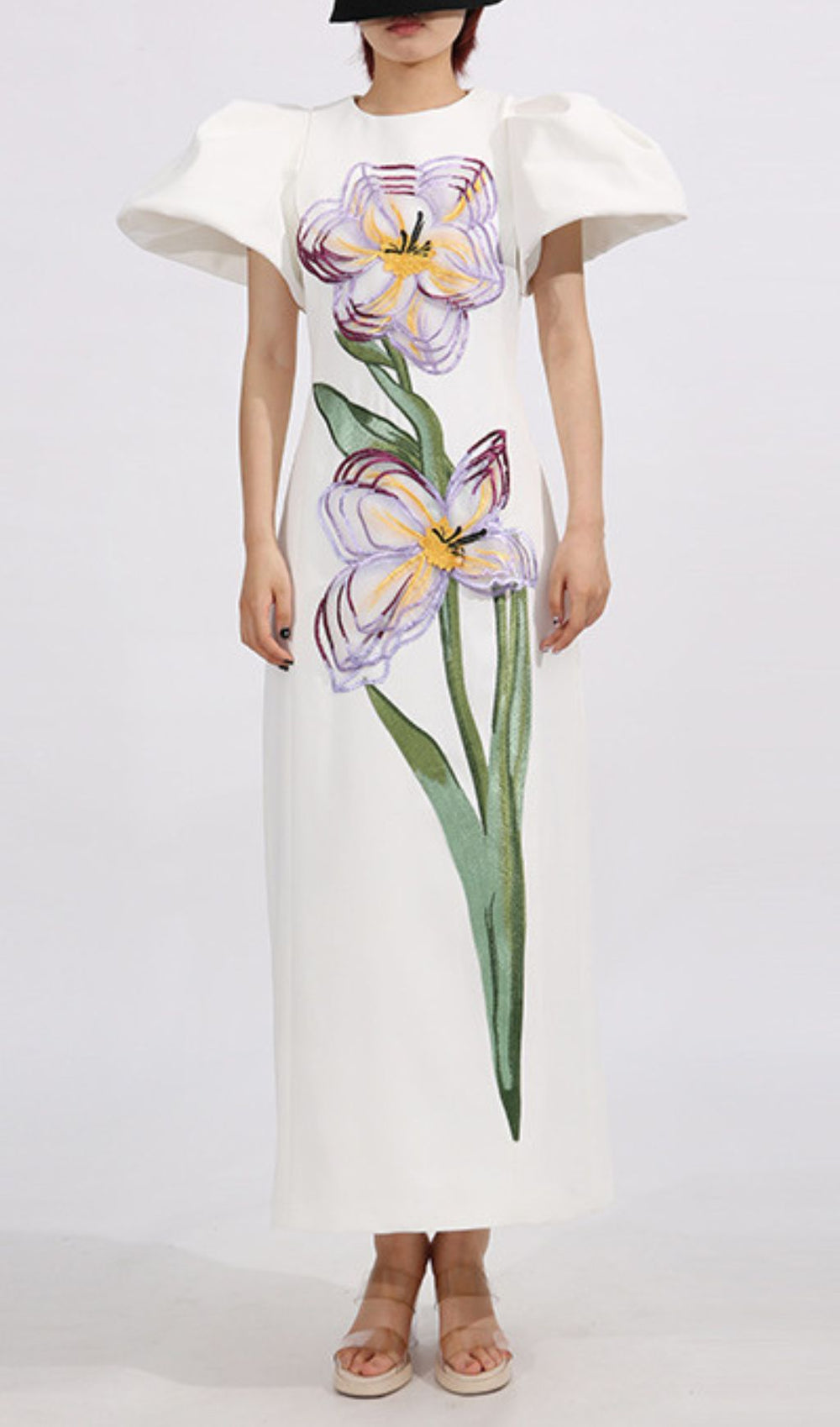 Crafted from crisp white fabric. this maxi dress features breathtaking. large-scale floral embroidery that cascades down the front. The vibrant hues of lavender. deep purple. and golden yellow. complemented by lush green stems. create an eye-catching. hand-painted effect that ensures you'll be the center of attention.