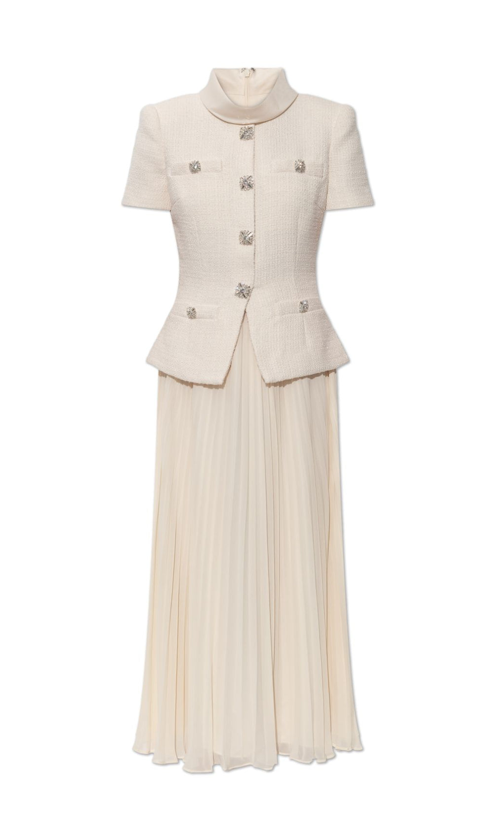 Step into sophisticated charm with our breathtaking Cream Embellished Tweed-Style & Pleated Midi Dress. This exquisite piece masterfully blends classic elegance with modern femininity. designed for the American woman who appreciates timeless style and luxurious details. Perfect for making a memorable impression at any special occasion. from elegant brunches to sophisticated evening affairs.