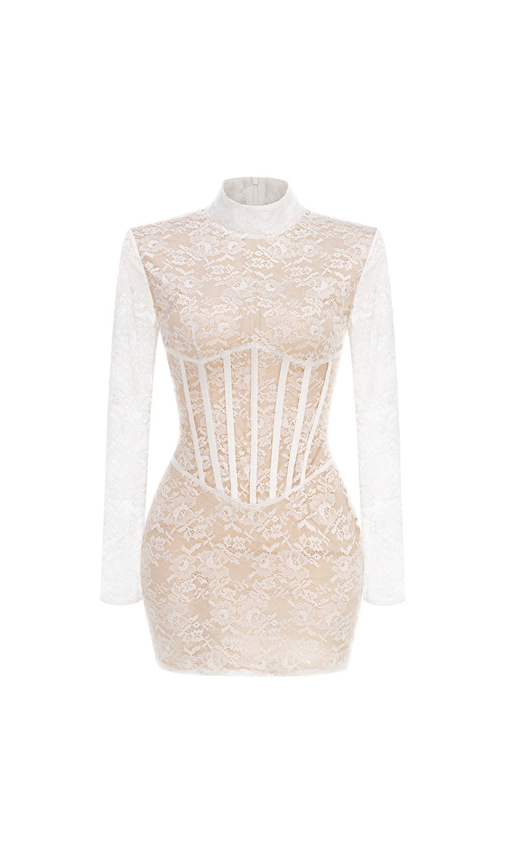Crafted from exquisite. delicate white lace. this mini dress beautifully blends alluring transparency with refined elegance. The intricate long sleeves and chic mock neckline offer a sophisticated touch. while the standout feature �a structured corset bodice with delicate boning �cinches your waist to create an undeniably flattering. figure-hugging silhouette. This isn't just a dress; it's an experience designed to make you feel empowered. playful. and utterly irresistible.