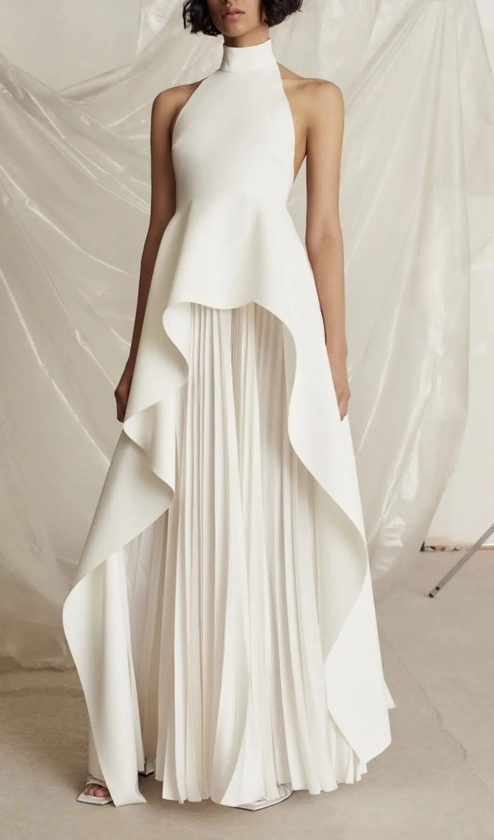 Step into the spotlight with our breathtaking White Halter Neck Pleated Maxi Dress. a true masterpiece of modern design. Perfectly tailored for the discerning woman. this dress seamlessly blends contemporary style with timeless grace. ensuring you make an unforgettable entrance at any special occasion.