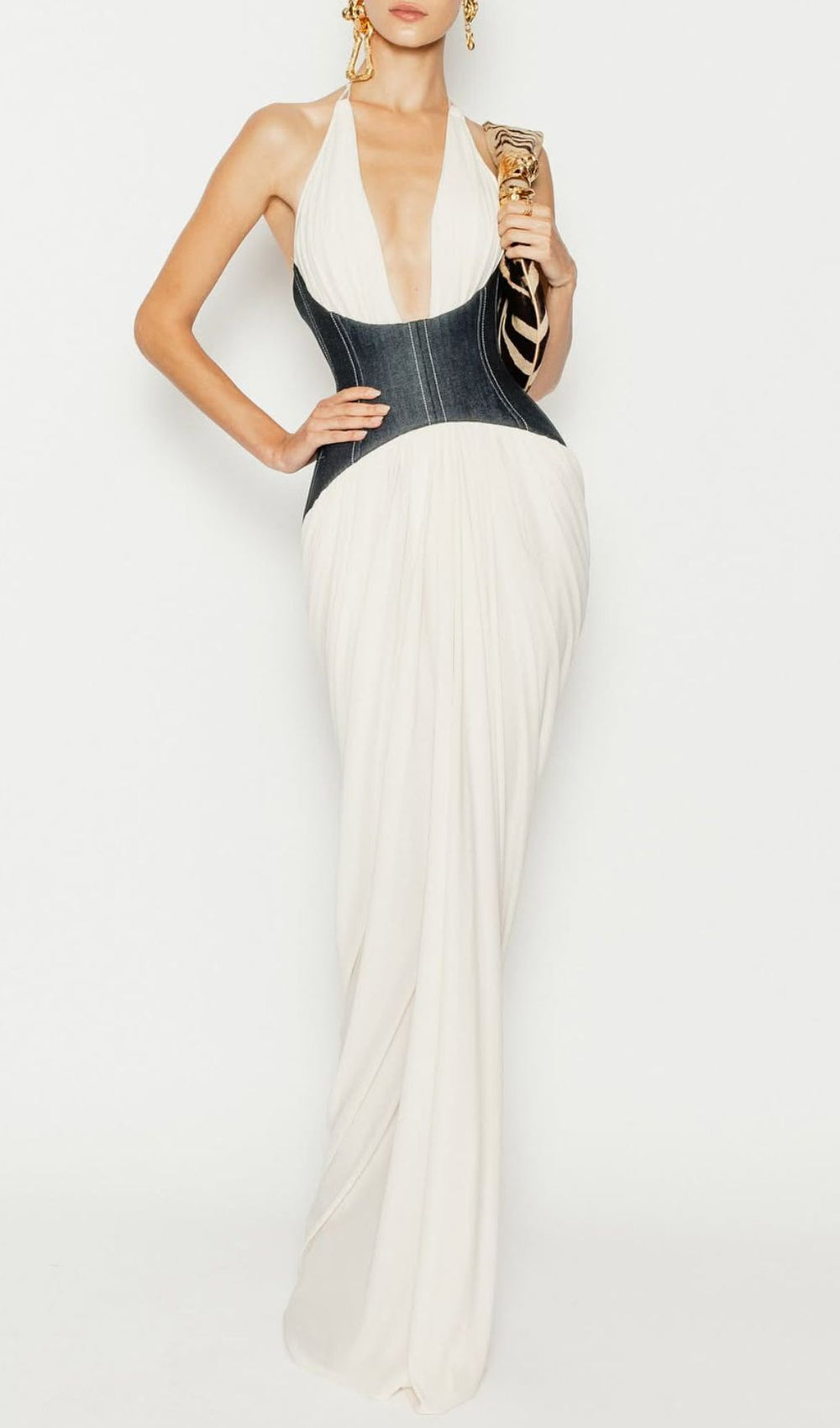Step into the spotlight and command attention with our breathtaking Emelda Halter Corset Maxi Dress. Designed for the modern American woman who embraces elegance and confidence. this dress is a true showstopper. Its exquisite design seamlessly blends a daring plunge halter neckline with a figure-sculpting corset bodice. flowing down into a graceful. floor-length maxi skirt.