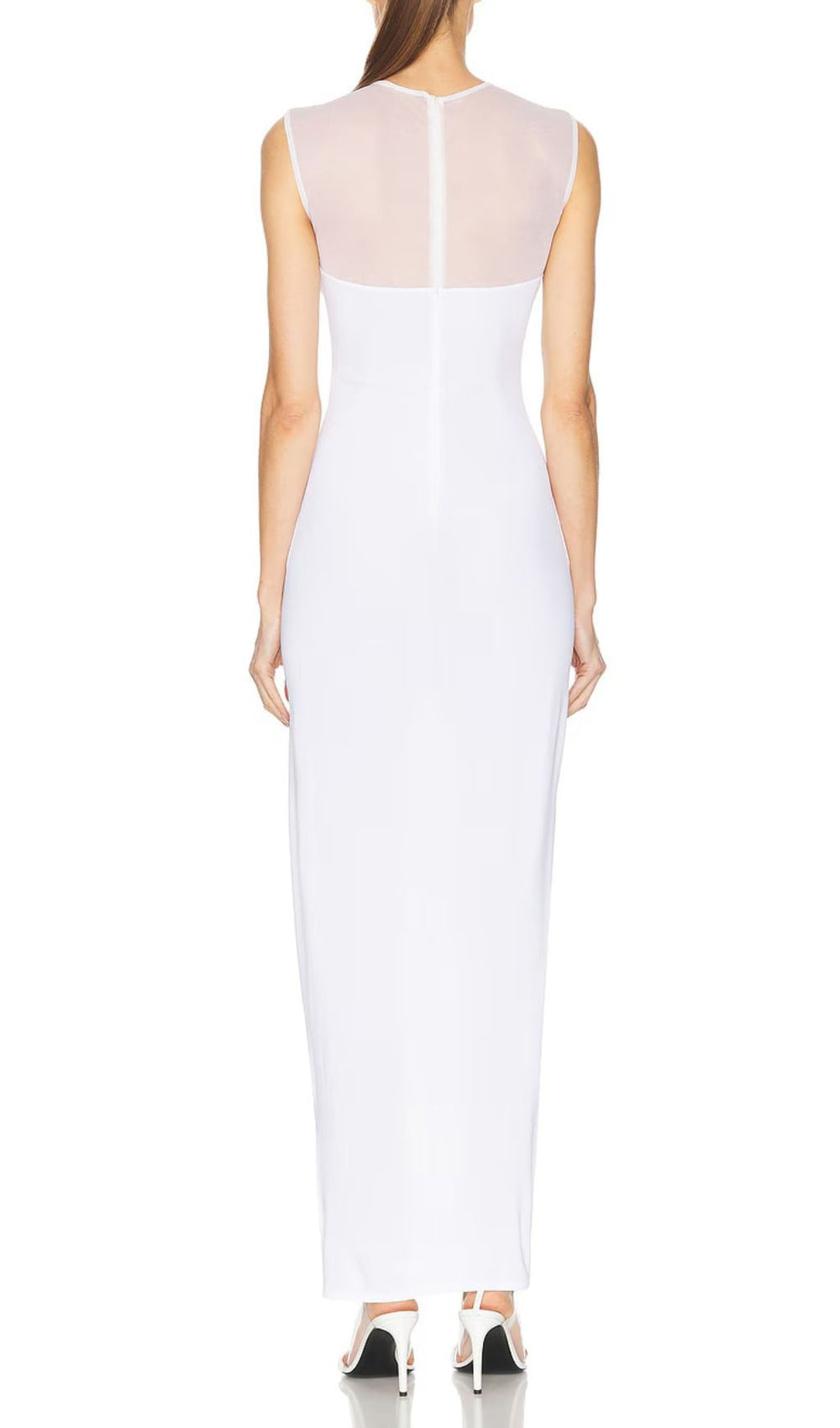 Step into the spotlight and command attention with the breathtaking Fadia White Mesh Illusion Maxi Dress. This gown is a true testament to modern sophistication and seductive design. perfectly crafted for the American woman who values bold style and confidence.
