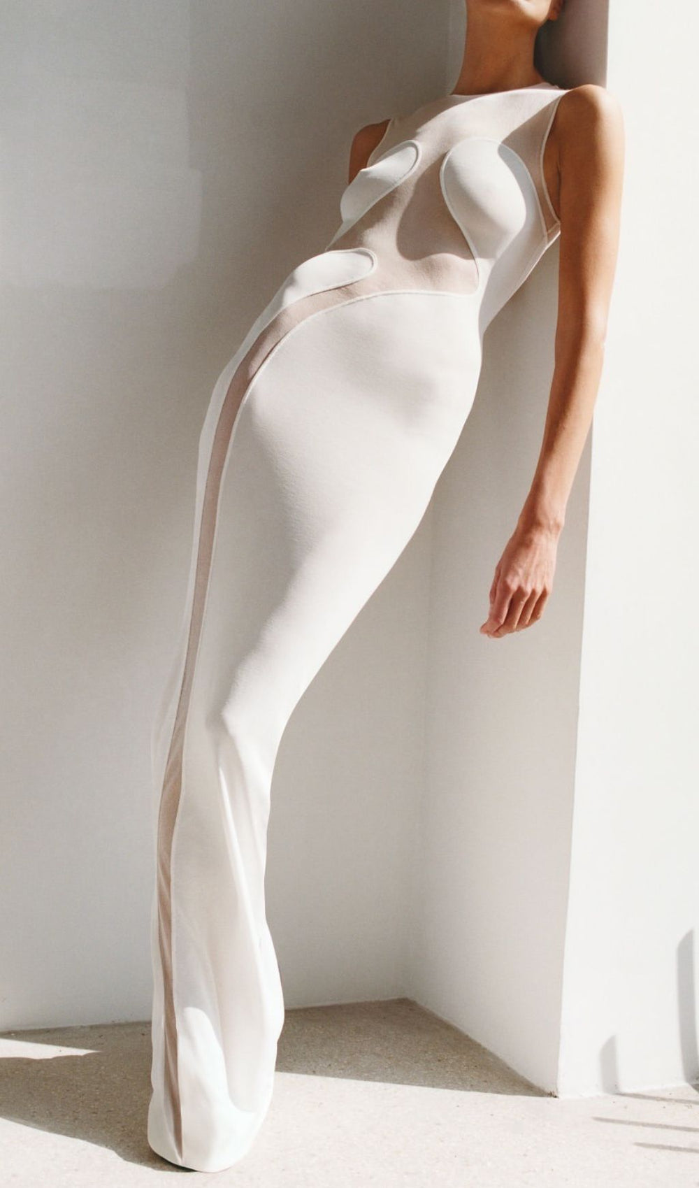Experience a silhouette that seamlessly blends allure with elegance. This maxi dress features strategically placed sheer mesh panels that create a captivating illusion. enhancing your natural curves while revealing just the right amount of skin. From the delicate mesh neckline to the artistic. wavy cutouts across the torso and down the side. every detail is designed to make a statement.