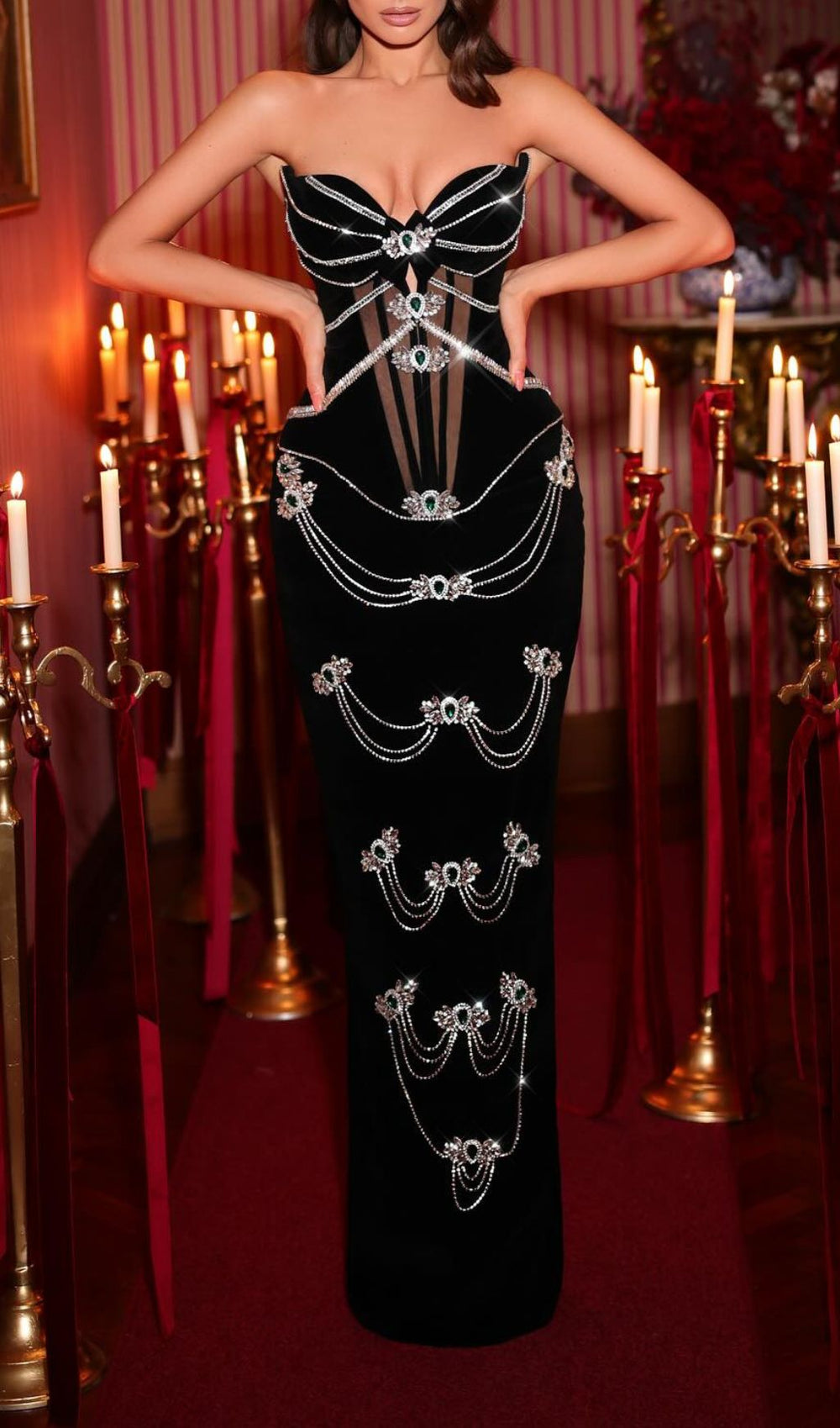 Prepare to command every room you enter with the breathtaking Fatima Black Emerald & Crystal Embellished Strapless Maxi Gown. This isn't just a dress; it's a statement. meticulously crafted to elevate your presence and ensure all eyes are on you.