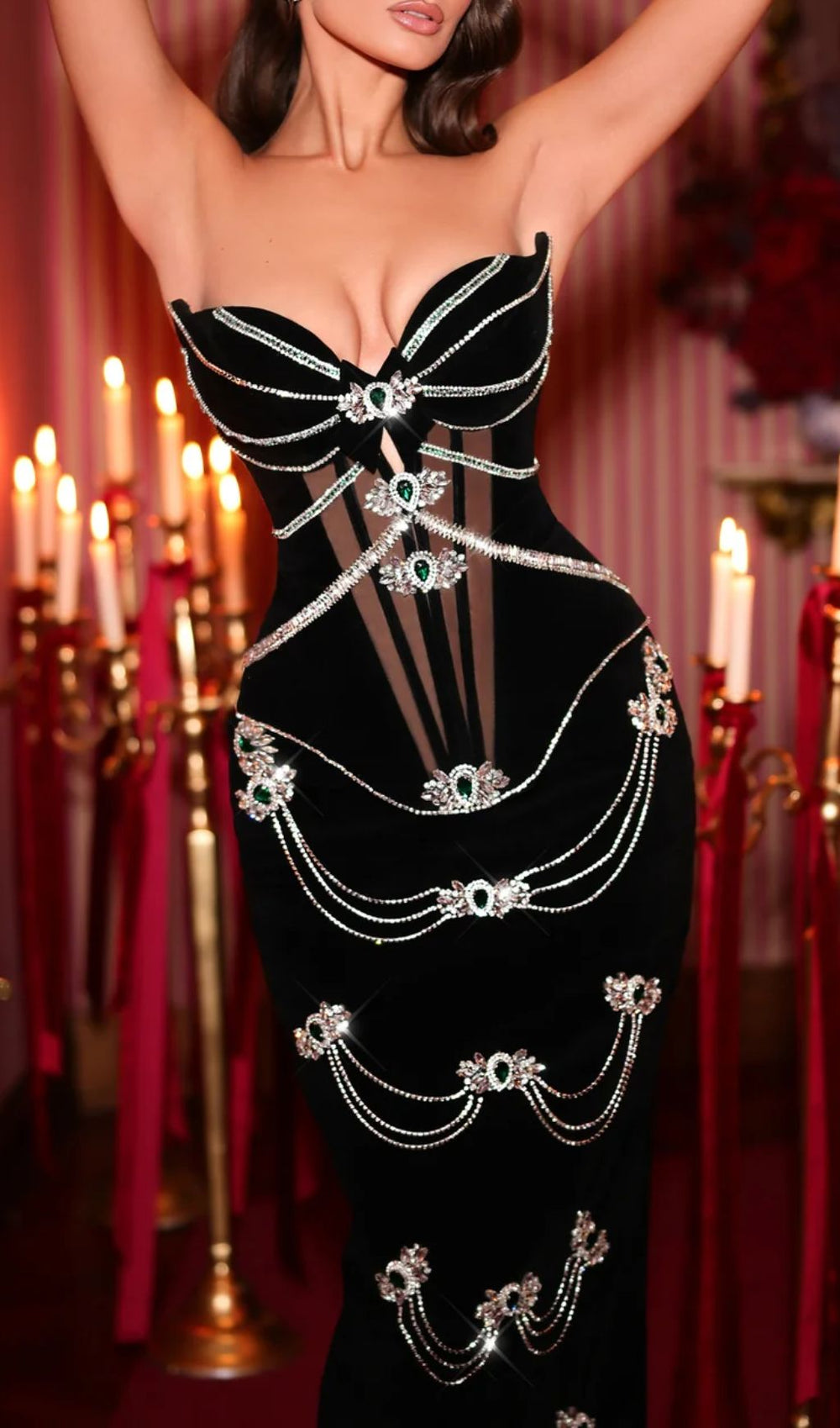 Inspired by opulent elegance and daring sophistication. this stunning black maxi gown features a captivating strapless sweetheart neckline that beautifully frames the colletage. The bodice is a masterpiece. boasting a delicate sheer mesh corset-style design adorned with shimmering silver crystals and captivating emerald green gemstone accents. creating an exquisite interplay of texture and sparkle. These radiant embellishments cascade down the sleek. curve-hugging bandage silhouette. illuminating your every move and highlighting your figure with unparalleled grace.