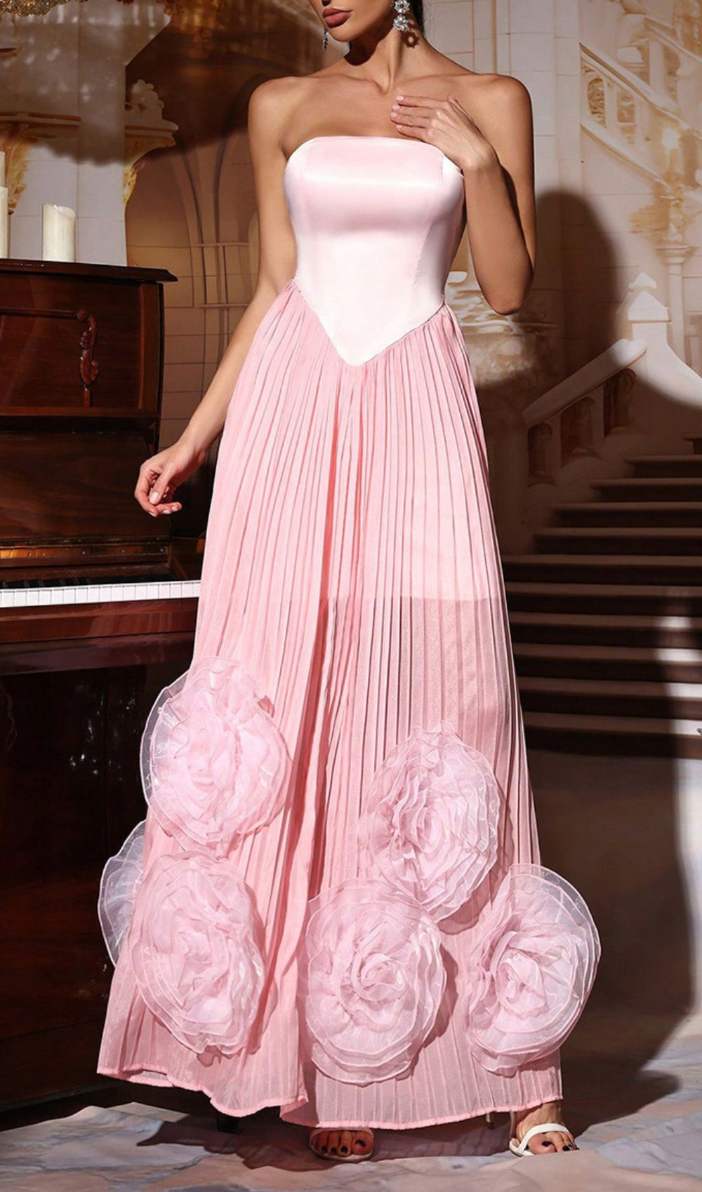 Step into an enchanting evening with the Florinda Pink Strapless Pleated Maxi Dress. a masterpiece designed to captivate and charm. This exquisite gown blends timeless elegance with modern romanticism. ensuring you're the picture of grace at any sophisticated affair. Its delicate blush pink hue and thoughtful details make it a truly unforgettable piece for your wardrobe.