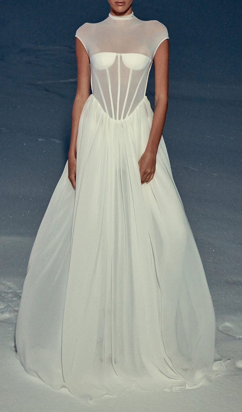 Embrace the fusion of dramatic structure and delicate grace. The Gabija Gown empowers you to command attention. radiating confidence and sophisticated charm. Its pristine white color makes it a timeless choice for memorable moments.