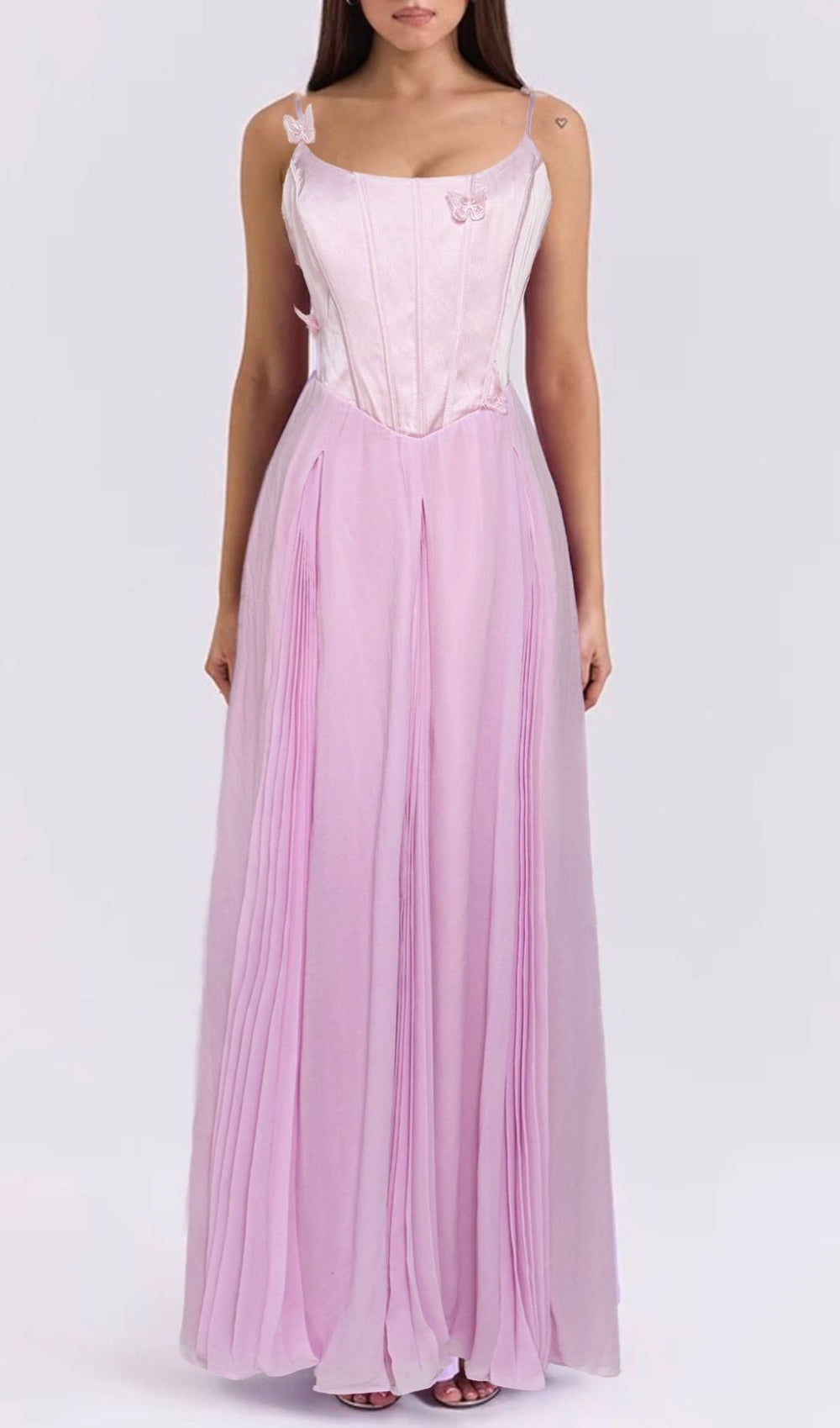 The meticulously structured corset bodice is a true masterpiece. featuring delicate boning that sculpts and flatters your figure. ensuring a confident and poised silhouette. Adorned with intricate. three-dimensional butterfly embellishments on the adjustable spaghetti straps and across the colletage. it adds a touch of playful romance and unique artistry. The soft. dreamy lavender hue evokes a sense of calm sophistication and enchanting beauty. perfectly complementing various skin tones.