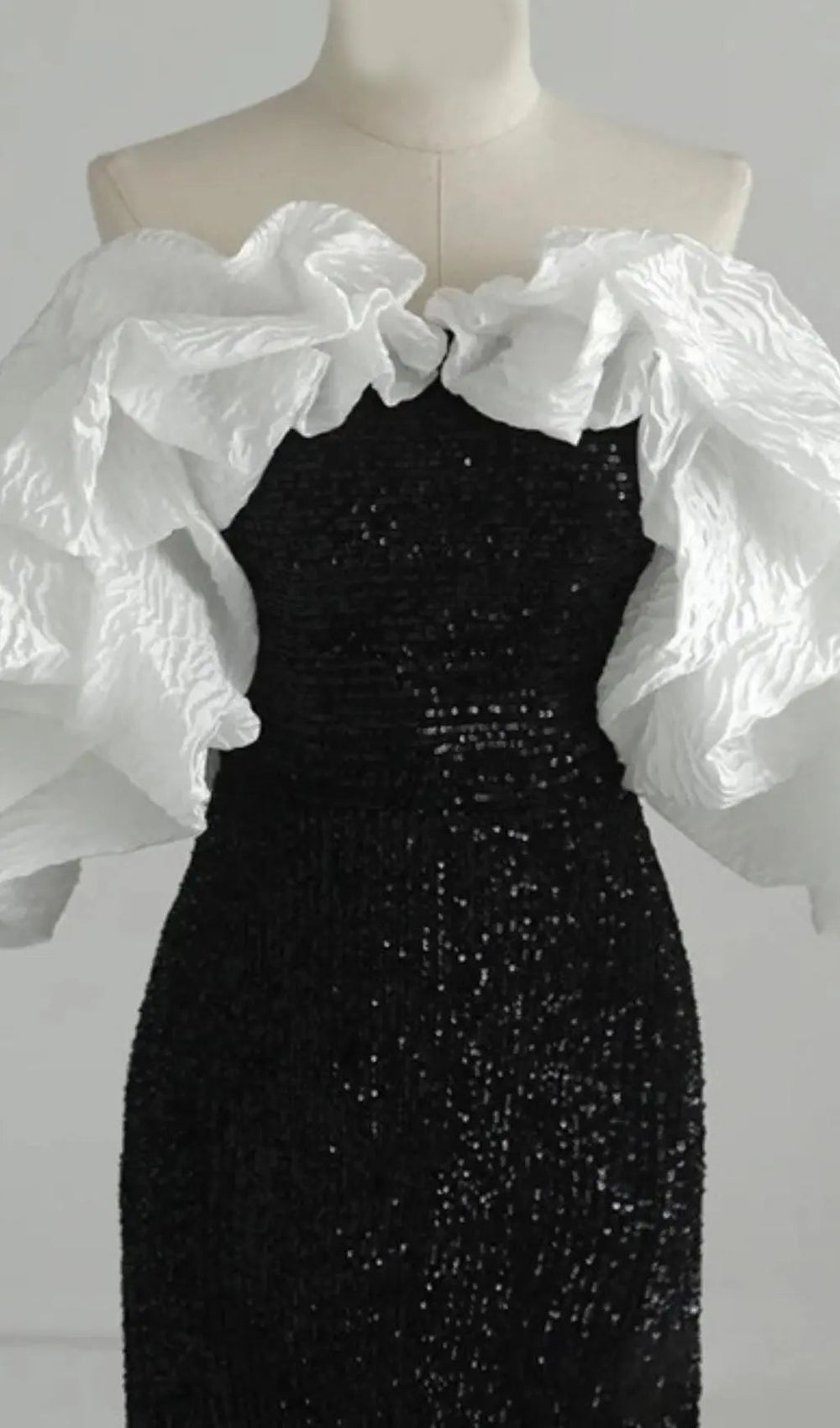 The dress features a dazzling all-over sequin fabric that shimmers beautifully with every movement. ensuring you sparkle from every angle. Its sophisticated off-shoulder neckline gracefully frames your colletage. leading to exquisite. voluminous bubble sleeves that add a touch of romantic drama and unique charm. While providing an elegant silhouette. the sleeves beautifully highlight your shoulders and collarbones.