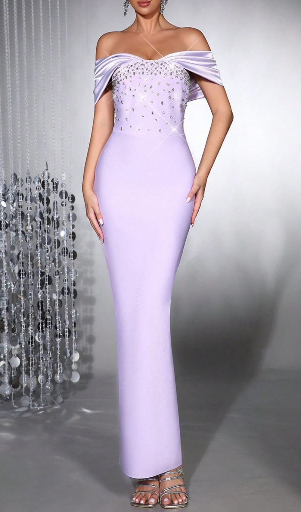 Step into the spotlight and command attention in the breathtaking Haf Lavender Embellished Off-Shoulder Maxi Gown. Designed for the woman who loves to make a dazzling statement. this exquisite dress blends timeless sophistication with modern glamour. Its enchanting lavender hue. reminiscent of delicate spring blooms. provides the perfect canvas for a cascade of shimmering embellishments.