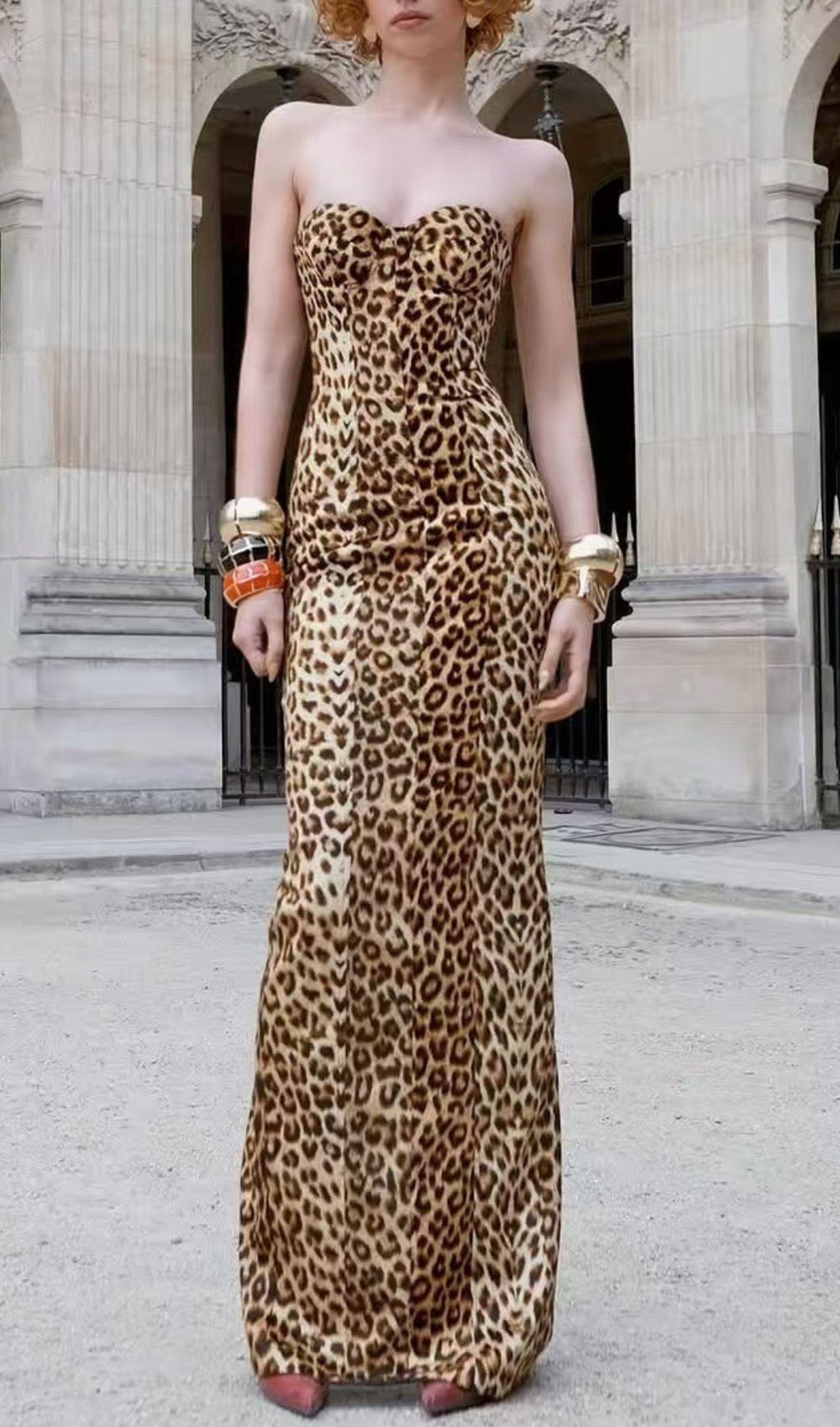 Step into the spotlight and command every room you enter with the breathtaking Hirokazu Strapless Leopard Maxi Dress. Designed for the woman who owns her power. this gown is a striking fusion of untamed spirit and refined elegance. Its iconic leopard print. a timeless symbol of confidence and allure. is meticulously crafted into a sleek. body-conscious silhouette that celebrates your curves and ensures a truly unforgettable presence.