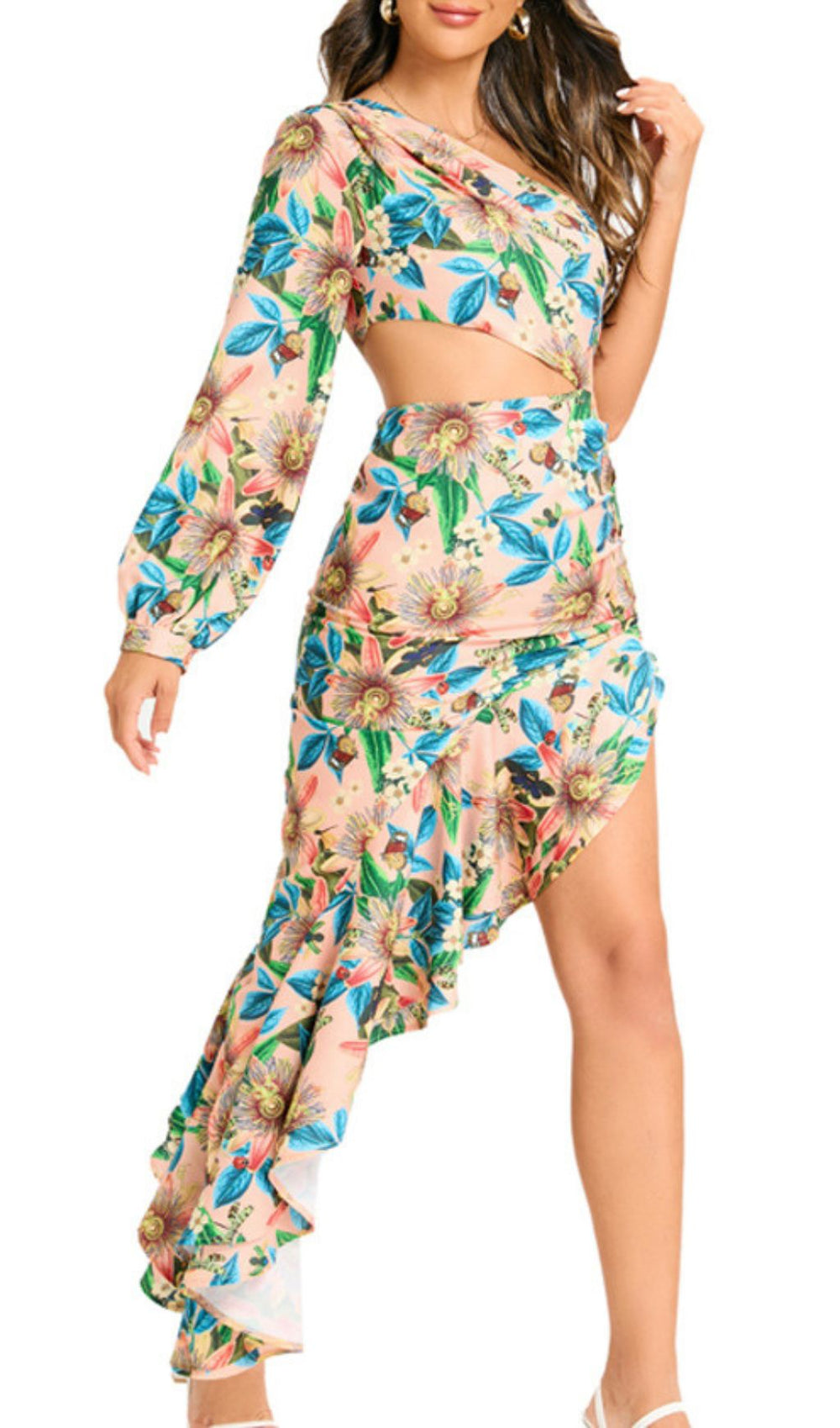 Step into the spotlight and command every room with the stunning Javen Floral One-Shoulder Cutout High-Low Dress. Designed for the modern American woman who loves to make a statement. this piece effortlessly blends bold asymmetry with vibrant tropical charm. Its captivating floral print. featuring lush blues. greens. and warm earth tones on a soft peachy base. evokes an irresistible vacation vibe. no matter where you are.