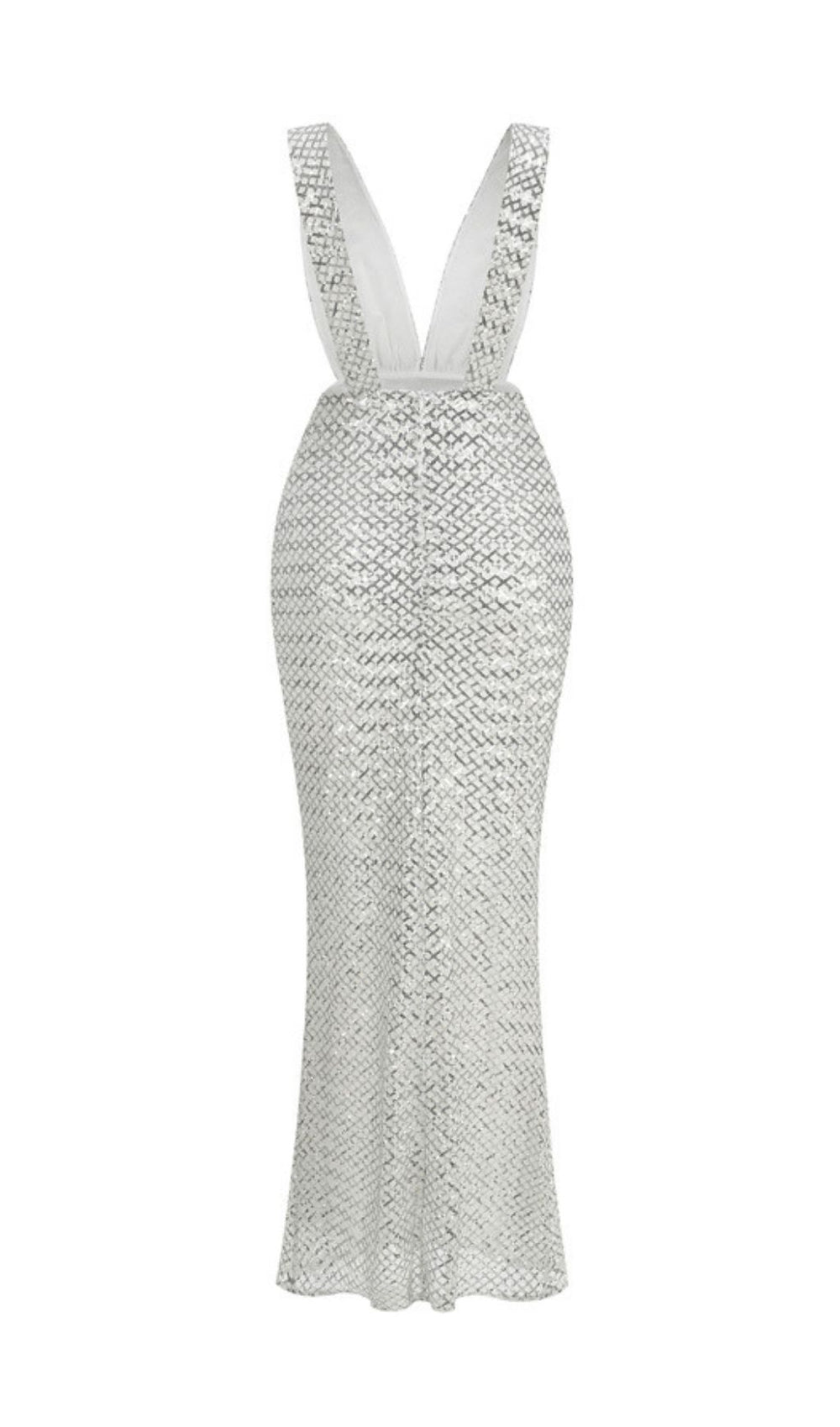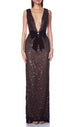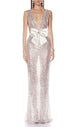 Crafted with thousands of delicate. shimmering sequins. the Jocelin gown exudes an ethereal glow. creating a silhouette that is pure modern opulence. Its fluid. column cut gracefully drapes to the floor. ensuring you glide with confidence and poise. The show-stopping feature is the oversized. luxurious satin bow. artfully placed at the waist to accentuate your figure and add a touch of sculptural femininity. Complemented by a sophisticated deep V-neckline. this gown ensures you're impeccably dressed for the most exclusive events.