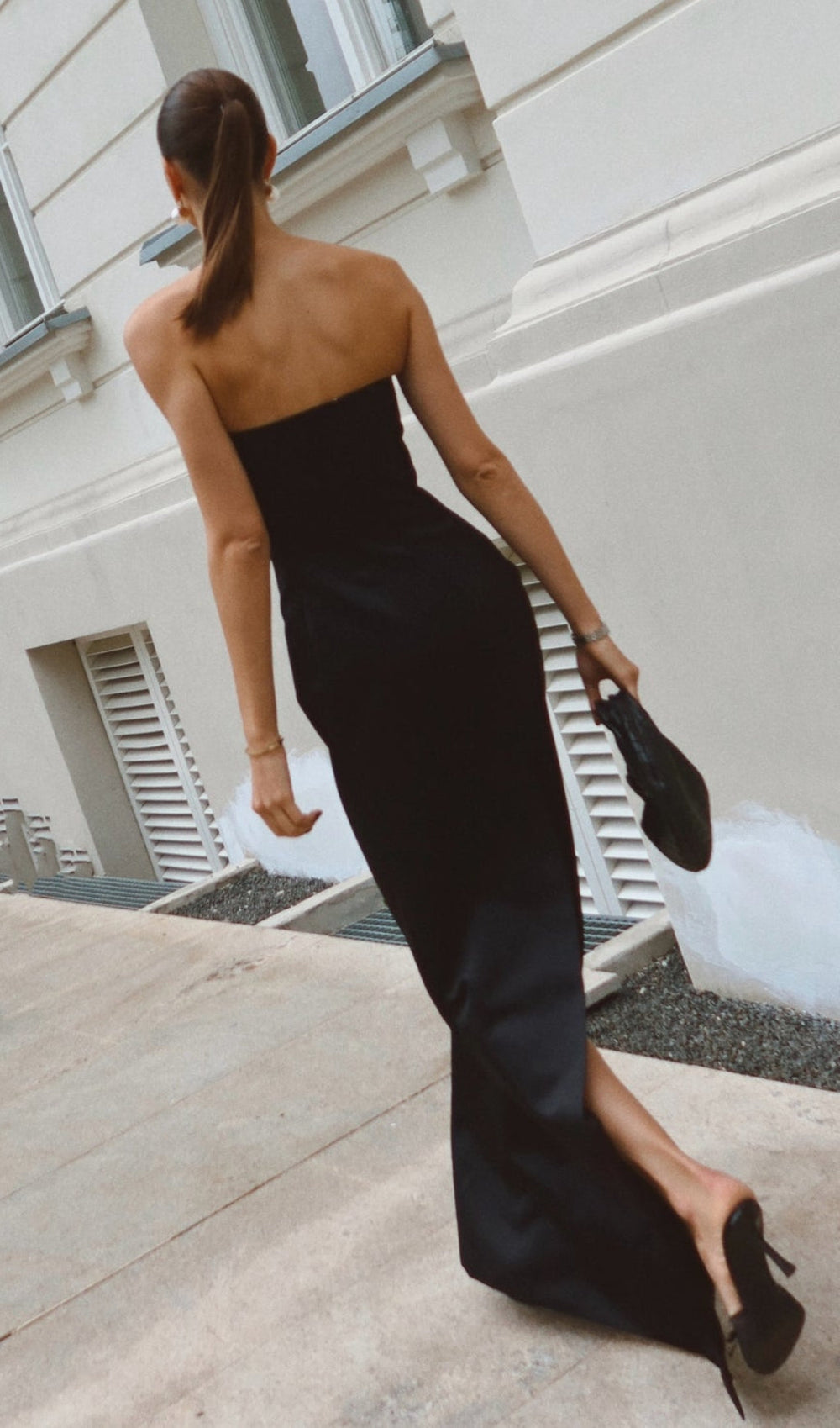 Command attention and exude sophisticated charm with our breathtaking Candy Black Strapless Crystal Bow Maxi Dress. Designed for the woman who loves to make a statement. this gown combines timeless elegance with modern allure. ensuring you're the focal point of any grand event.