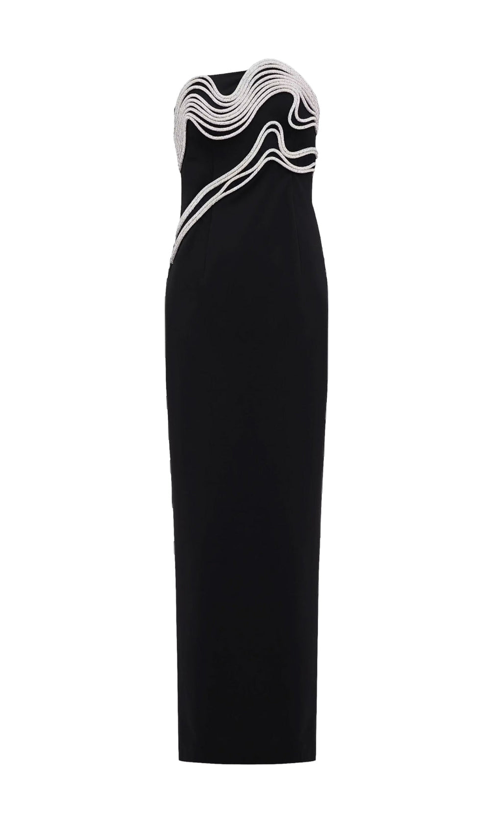 Introducing the Akiko Crystal Embellished Maxi Gown. a true masterpiece designed to captivate and charm. This stunning black strapless dress features an exquisite cascade of shimmering silver crystals. intricately adorning the bodice and gracefully tracing a path down the torso. It's more than just a dress; it's a statement of sophisticated glamour and undeniable allure. crafted for the woman who demands attention and confidence at every grand event.
