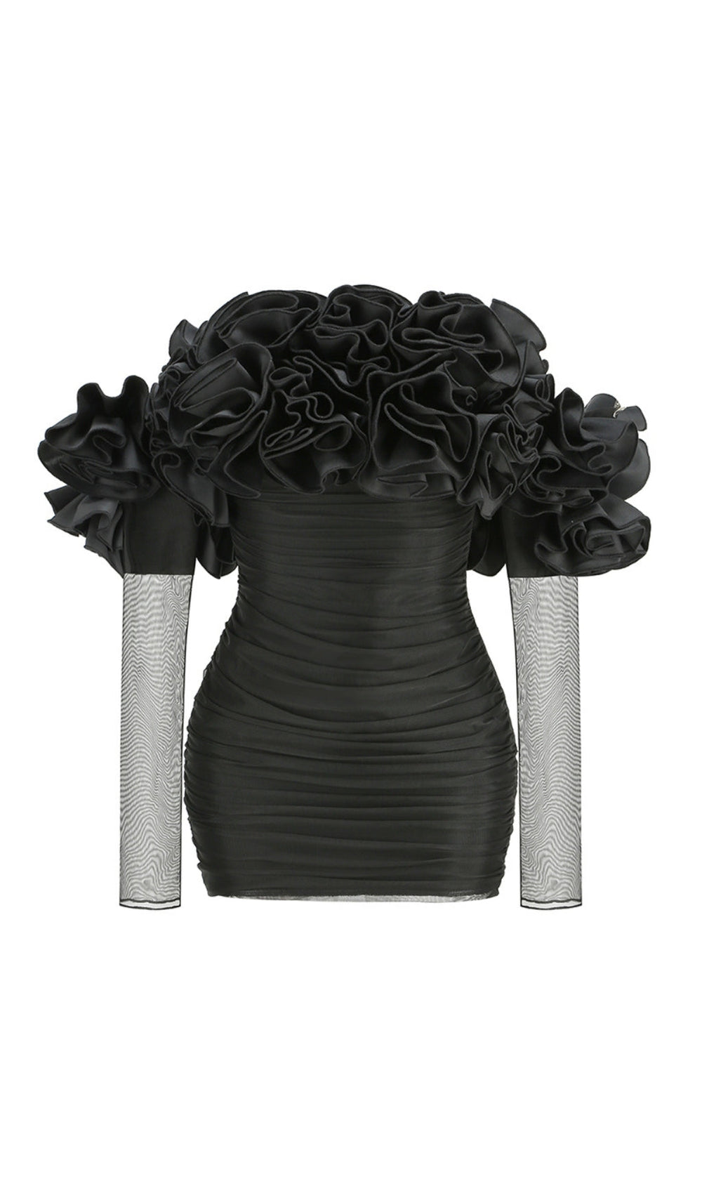 Command attention and radiate confidence in the Bard Black Off-Shoulder Floral Ruffle Mesh Mini Dress. This isn't just a dress; it's a meticulously crafted statement piece designed for the modern woman who dares to stand out. Its unique blend of feminine allure and contemporary edge makes it your go-to for any occasion where you want to make an unforgettable entrance.