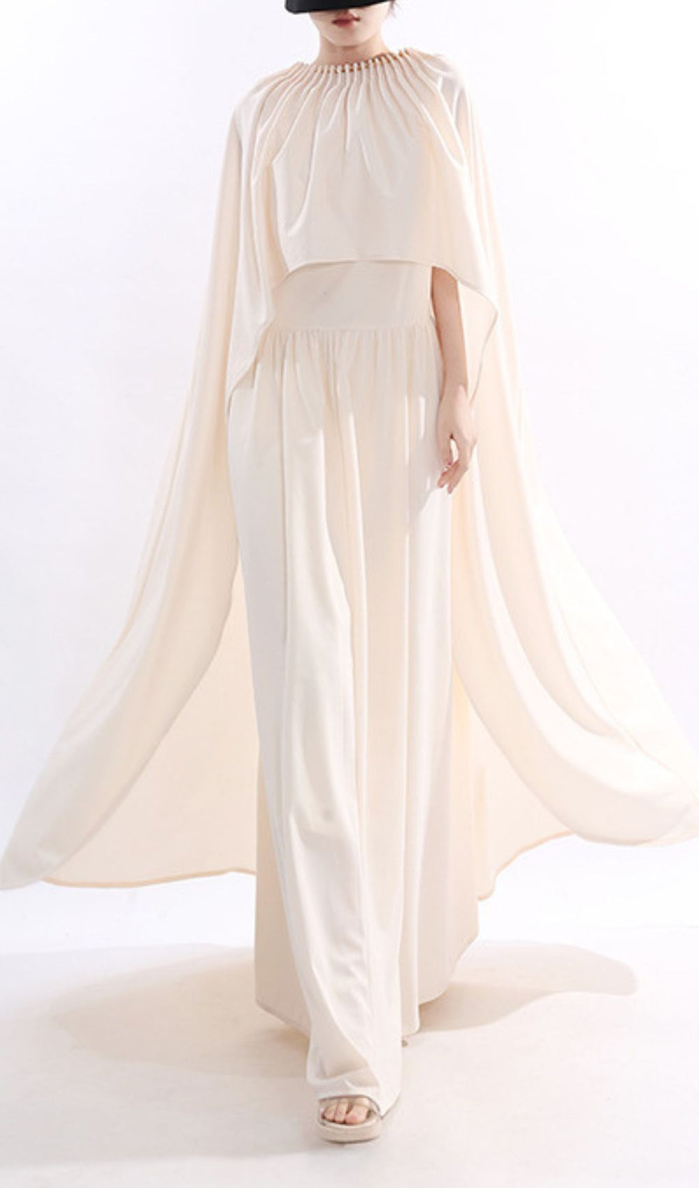 The centerpiece? A magnificent. flowing cape that drapes with ethereal grace. instantly imbuing your look with an air of mystery and dramatic flair. Beneath this captivating overlay lies a beautifully tailored maxi dress that promises a supremely flattering silhouette. designed to enhance your natural curves and provide ultimate comfort.