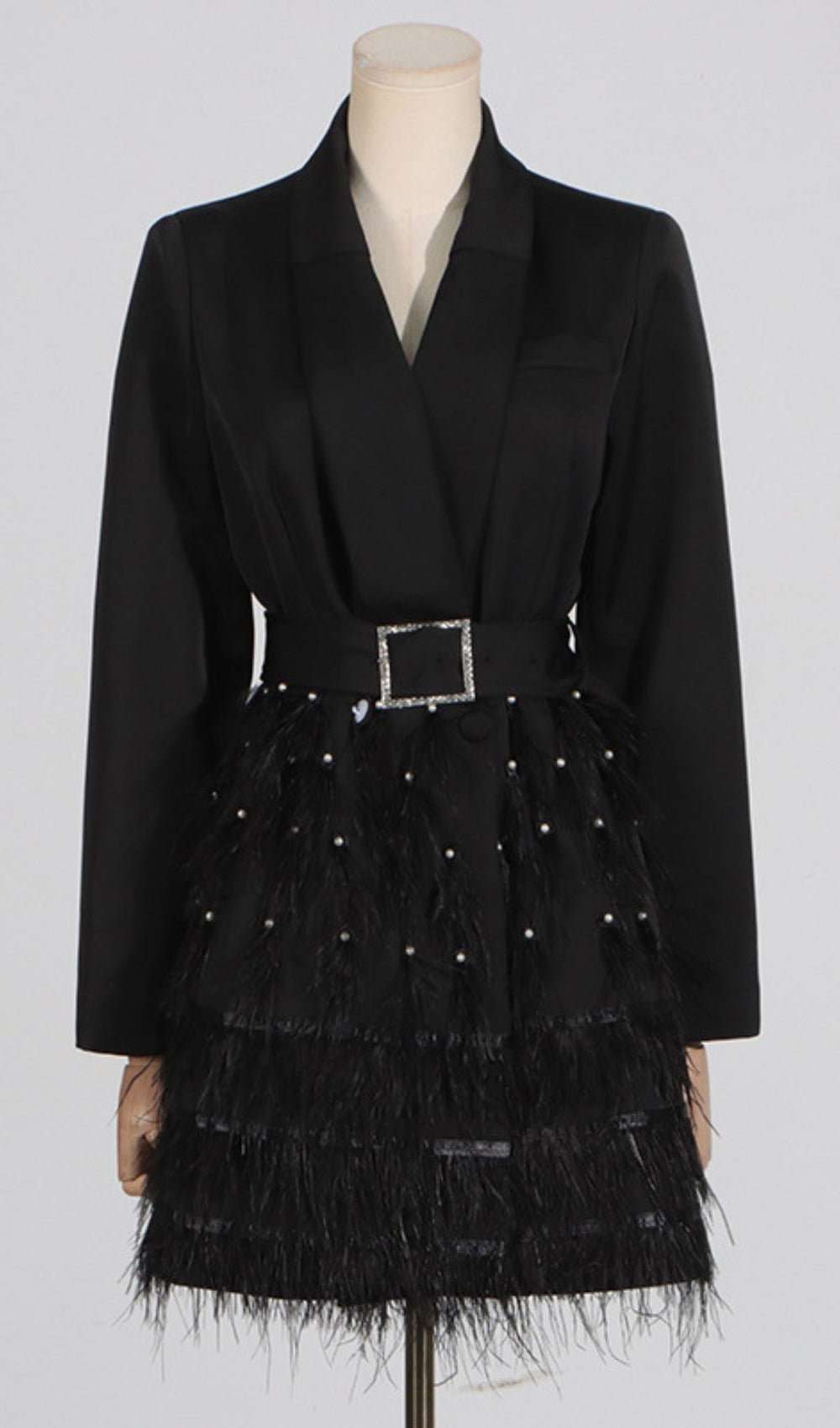 Step into the spotlight and command attention with the exquisite Caelia Luxe Black Feather Blazer Mini Dress. Designed for the modern American woman who dares to be bold. this dress is your ultimate ticket to effortless glamour and sophisticated style. It's not just a dress; it's a statement piece crafted to make every moment unforgettable.