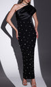 From the moment you slip it on. you'll feel the luxurious embrace of its premium fabric. perfectly sculpting your silhouette. The eye-catching one-shoulder design features an elegant. draped detail that adds a touch of modern sophistication. while the bodice and flowing skirt are adorned with a constellation of dazzling crystals. Each crystal catches the light with every movement. ensuring you sparkle from every angle.