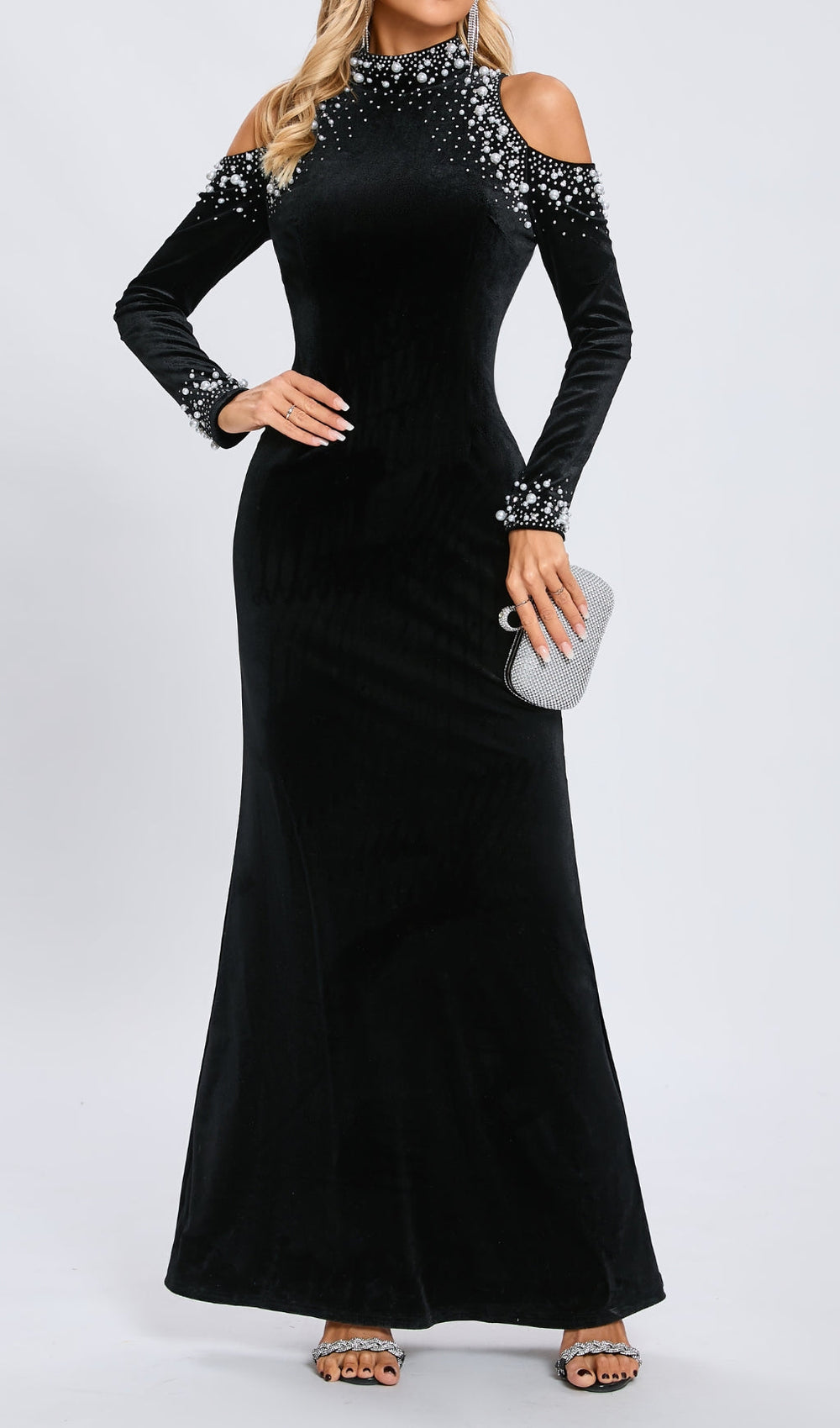Designed to captivate. this gown features a sophisticated mock neck adorned with a breathtaking array of dazzling pearl and rhinestone embellishments. These shimmering accents extend elegantly along the chic cold shoulder cut-outs and onto the graceful long sleeves. culminating in beautifully detailed cuffs. The figure-flattering silhouette gracefully drapes to a maxi length. ensuring a sleek and glamorous look that enhances your natural curves.