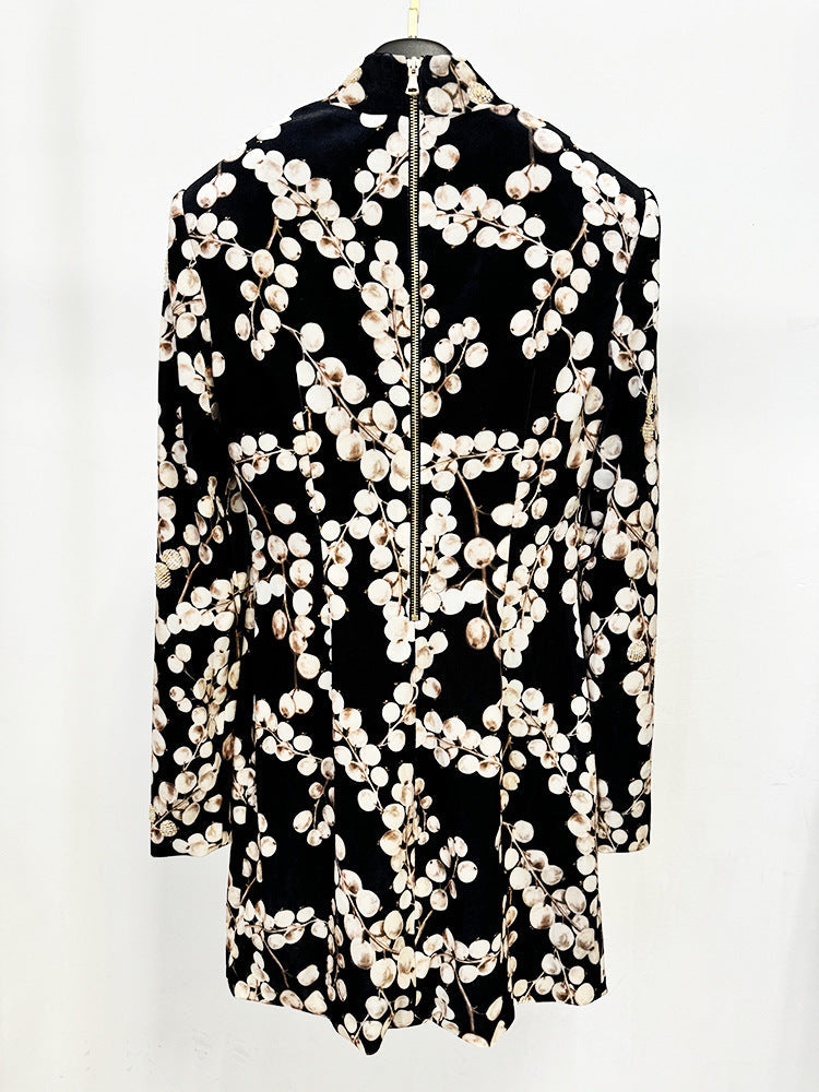 Experience an unparalleled fusion of comfort and high-fashion elegance. The dress features a unique. captivating redcurrant print—a delicate arrangement of shimmering white and gold clusters that evoke a "frosted berry" aesthetic against a rich. deep black canvas. This intricate pattern ensures you stand out with understated opulence.