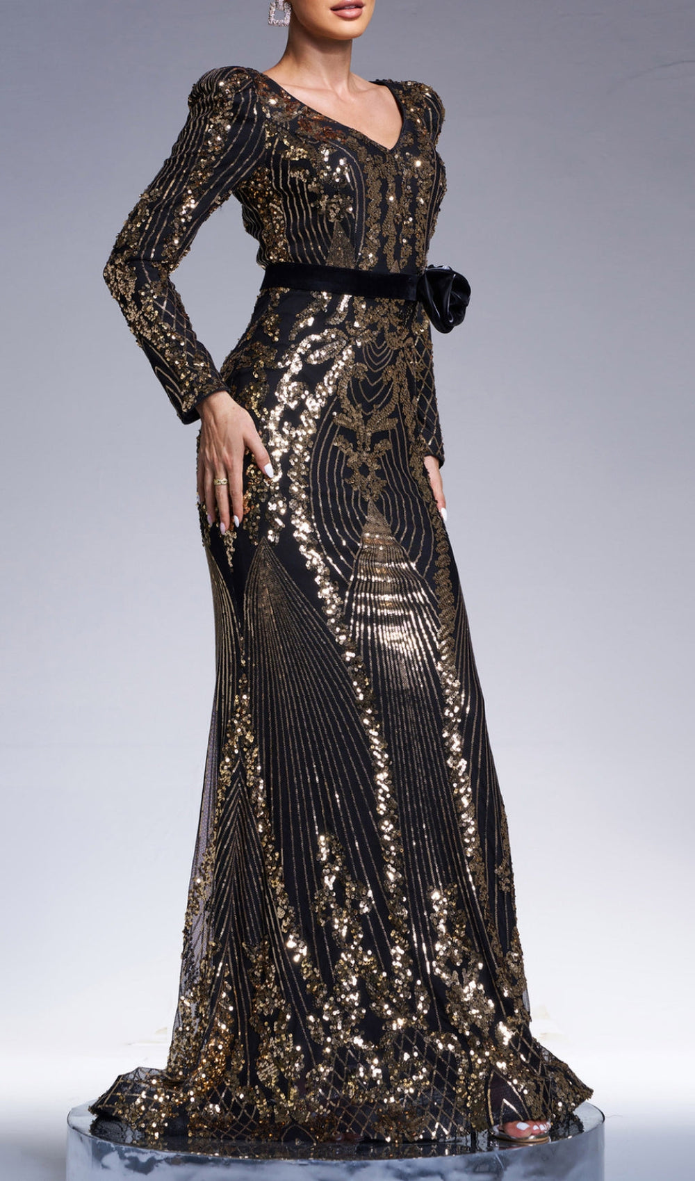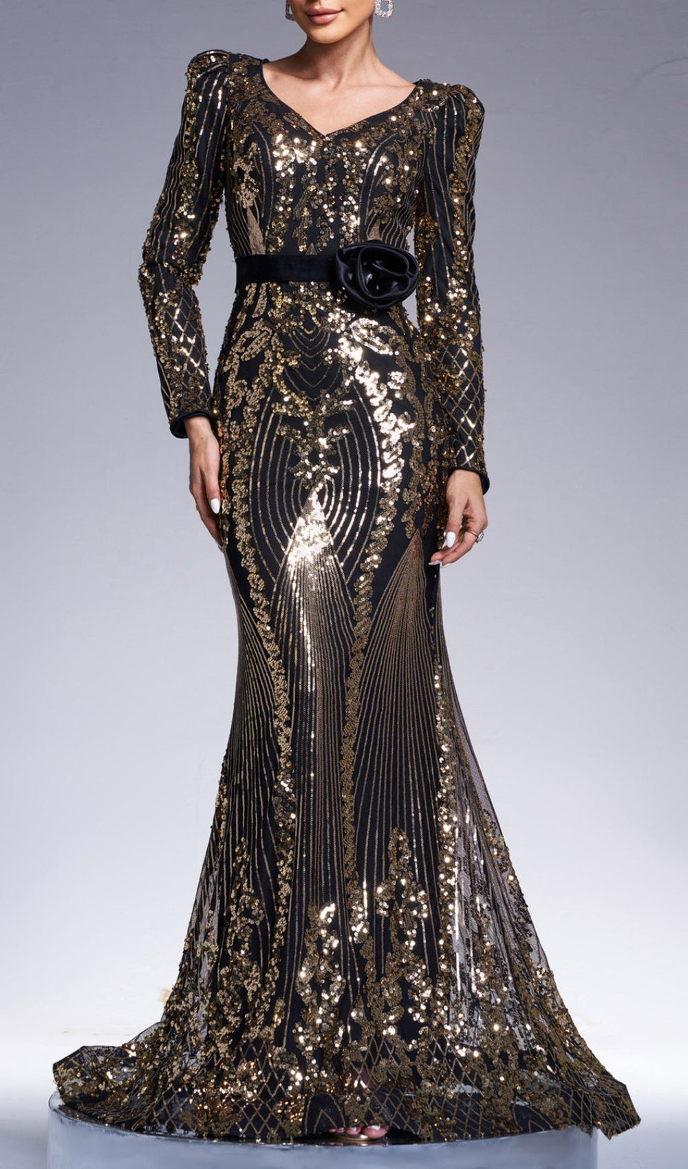 Crafted with meticulous attention to detail. this gown features an intricate display of shimmering gold sequins against a rich black backdrop. creating a captivating Art Deco-inspired pattern that cascades beautifully. The elegant V-neckline. coupled with chic long sleeves. offers a refined yet modest appeal. perfect for any formal occasion.