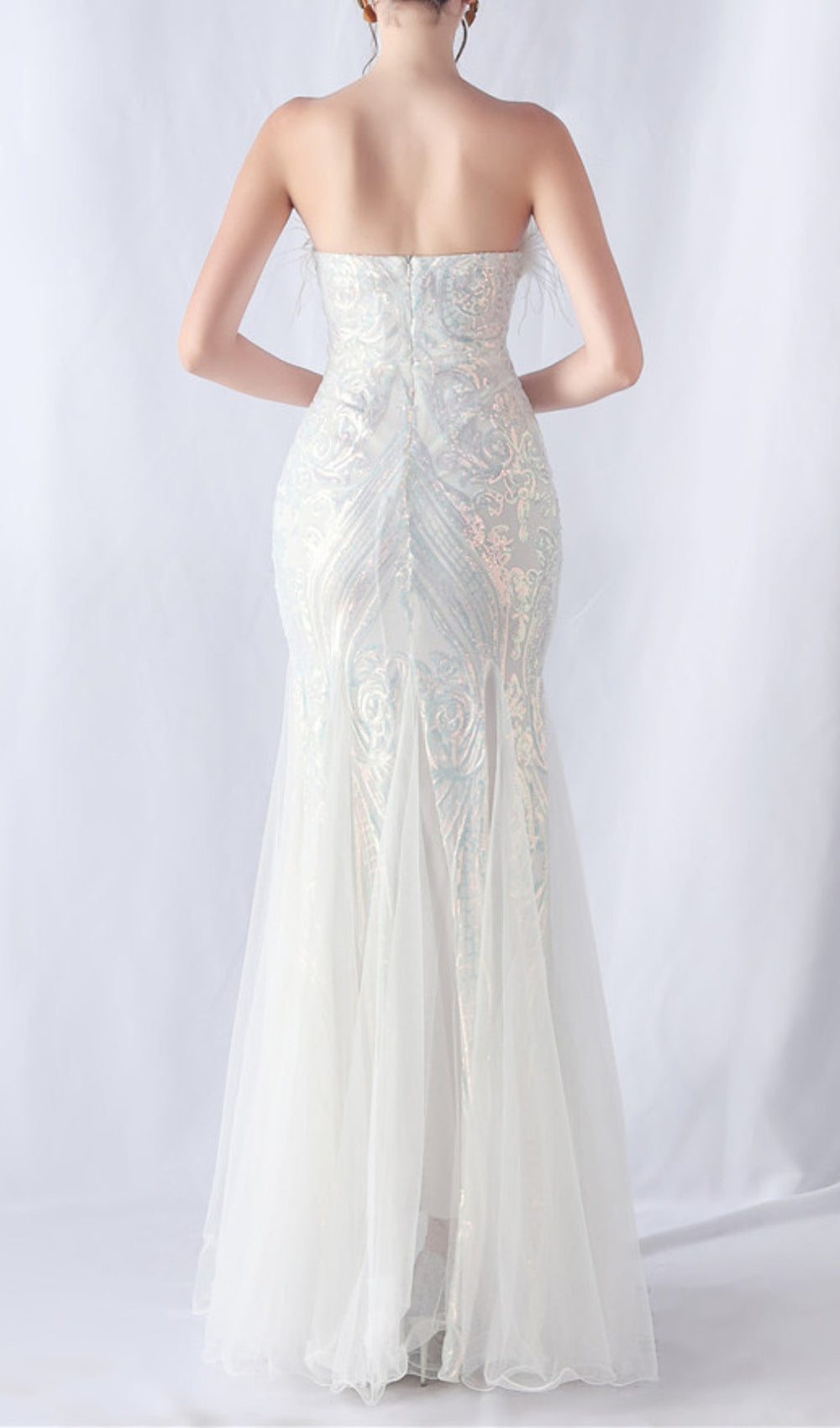 Don't just attend the event. own it. Elevate your formal wear collection with the Choire White Sequin Feather Mermaid Maxi Gown and let your impeccable style take center stage.