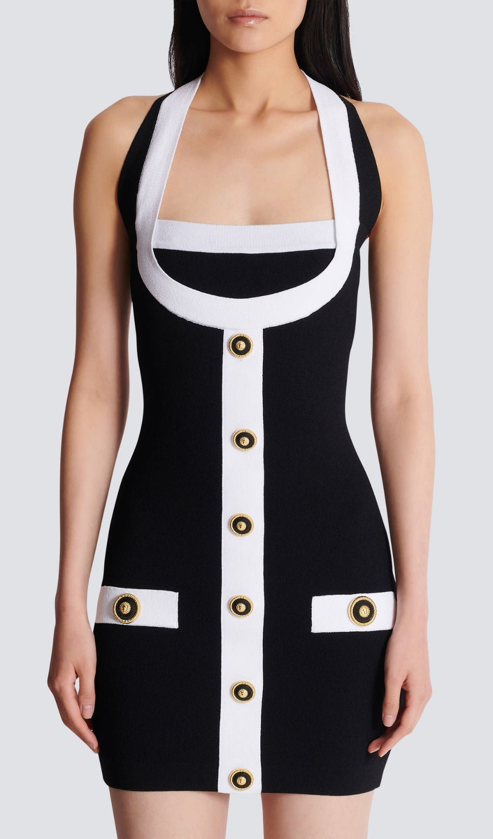 Crafted from a premium bandage knit. this mini dress is engineered to hug your curves in all the right places. creating a sculpted. figure-flattering silhouette that will make you feel confident and unstoppable. The elegant halter neckline beautifully frames your colletage. leading to a sophisticated square-cut bodice. Striking white contrast trim outlines the neckline and features a bold vertical stripe down the front. adorned with a series of exquisite gold-rimmed black buttons. Two faux pocket details on the skirt. each embellished with matching gold buttons. add a touch of classic chic.