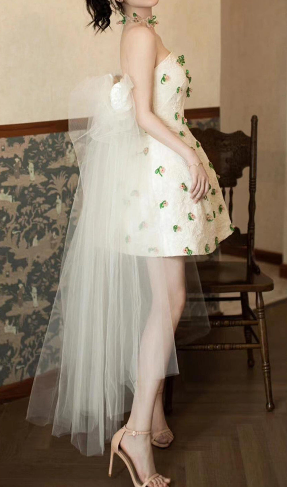 The enchanting design features a flattering strapless silhouette that gracefully highlights your colletage. exuding an air of confidence and allure. What truly sets the Dalila apart is its intricate. delicate floral embroidery and embellishments. subtly scattered across the cream-colored fabric. These charming blossoms and leaves add a touch of romantic whimsy. ensuring you radiate a unique glow that's both elegant and utterly captivating. Its playful mini length keeps you chic. while the quality craftsmanship promises comfort and a perfect fit.