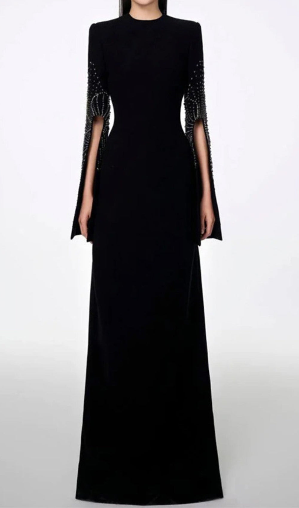 Make an unforgettable entrance at your next event with the Dalit Black Beaded Split-Sleeve Maxi Dress. This captivating gown is designed to flatter and empower. featuring a timeless black hue paired with an exquisite. modern silhouette. Crafted for the American woman who appreciates sophisticated style and unique detailing. this dress is a true statement piece.