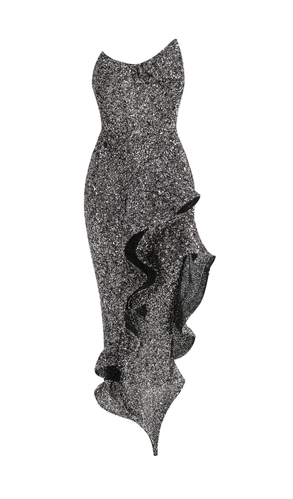 Step into the spotlight and command every room with the Douce Strapless Sequin Ruffle Maxi Dress. Designed for the modern American woman who dares to dazzle. this exquisite gown is your ticket to an unforgettable evening. blending sophisticated elegance with playful allure.