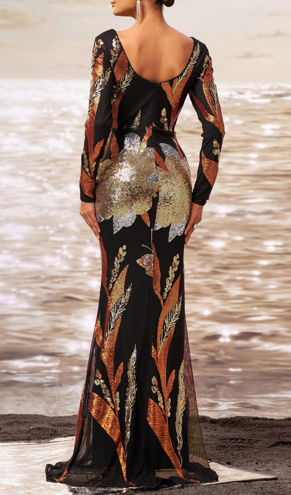 Adorned with an exquisite tapestry of shimmering sequins in rich gold. sophisticated silver. and warm bronze hues. the Debby dress features a stunning botanical-inspired pattern that flows gracefully from the flattering V-neck bodice down to the floor-sweeping hem. The elegant long sleeves add a touch of refined modesty while ensuring all eyes are on your dazzling presence. Its figure-flattering silhouette. designed to hug your curves before gently flaring. creates a truly show-stopping look that combines classic sophistication with modern sparkle.