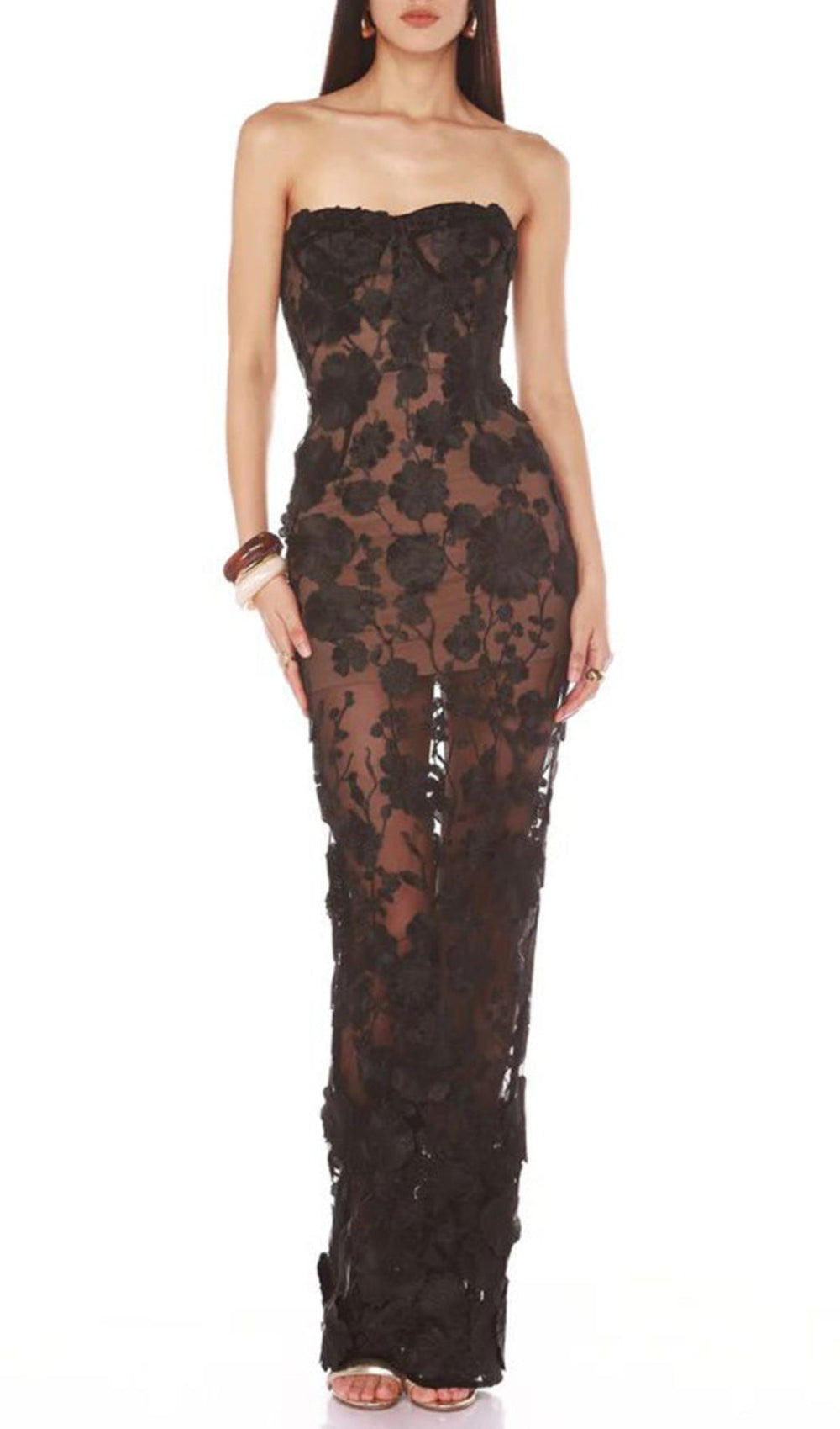 Step into a world of sophisticated allure with our breathtaking Decla Black Strapless 3D Floral Maxi Gown. Designed for the woman who desires to make an unforgettable entrance. this dress is a true masterpiece of elegance and contemporary style. The exquisite design features a flattering strapless neckline that beautifully highlights your colletage. while the intricate. three-dimensional floral appliques cascade gracefully down the sheer. body-hugging silhouette. creating a stunning visual texture and an aura of delicate mystery.