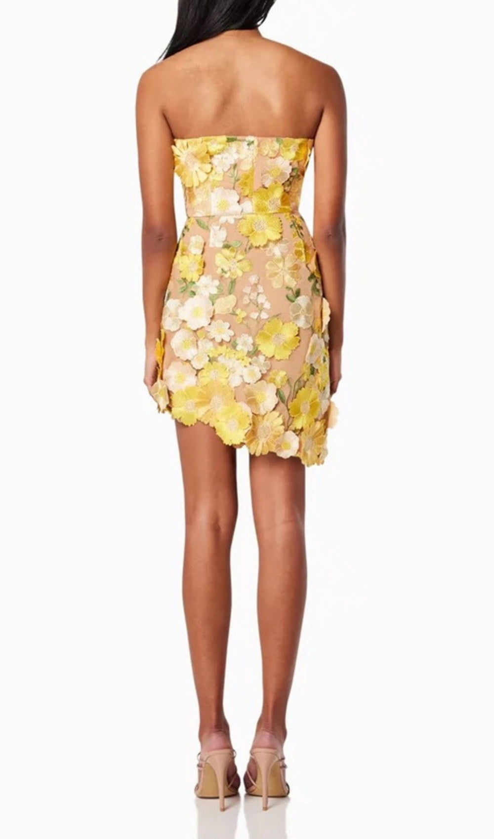 Step into the spotlight and radiate pure sunshine with the Destinee Yellow Flower Embellished Mini Dress! This exquisite piece is designed to make you feel utterly confident. feminine. and undeniably chic. Adorned with a captivating array of vibrant yellow and delicate white 3D floral embellishments on a flattering nude mesh base. this strapless mini dress creates a stunning. ethereal effect that's sure to turn heads.