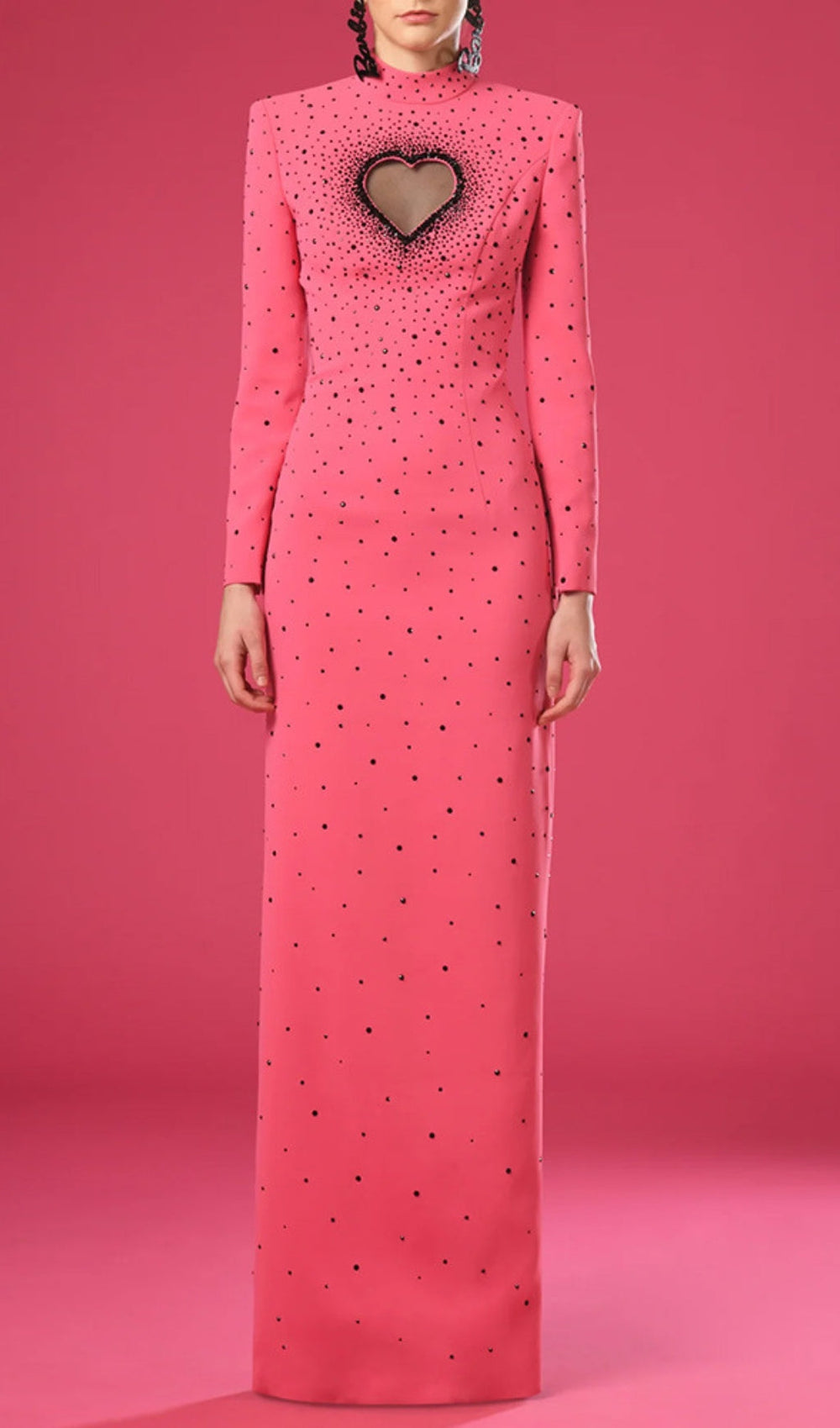 Make an unforgettable entrance and capture every gaze with the Duri "Radiant Heart" Pink Long Sleeve Maxi Dress. Designed for the woman who dares to stand out. this stunning gown is a true masterpiece of modern glamor. blending bold design with exquisite detailing.