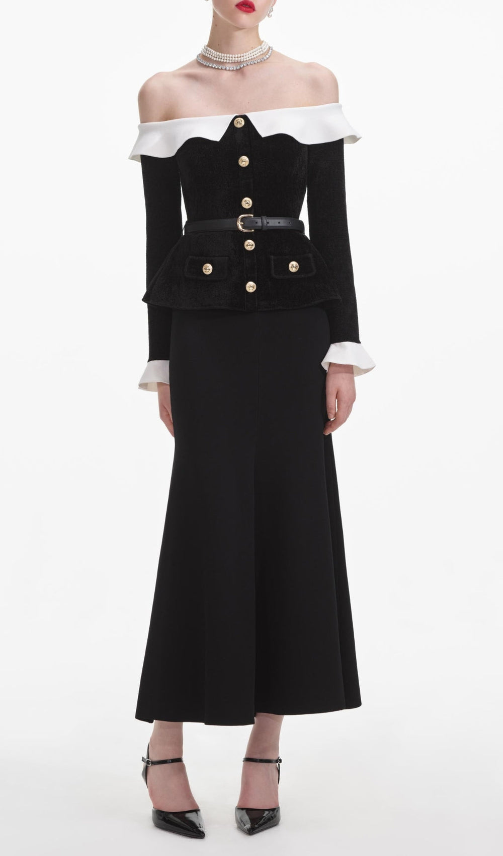 The impeccably tailored top features a chic peplum hem that cinches at the waist. creating an enviable hourglass figure. Adorned with striking faux gold button embellishments down the front and on the functional waist pockets. this dress adds a touch of bespoke detail and visual interest. The long sleeves end in sophisticated white ruffled cuffs. perfectly mirroring the off-shoulder detail and enhancing its timeless appeal.