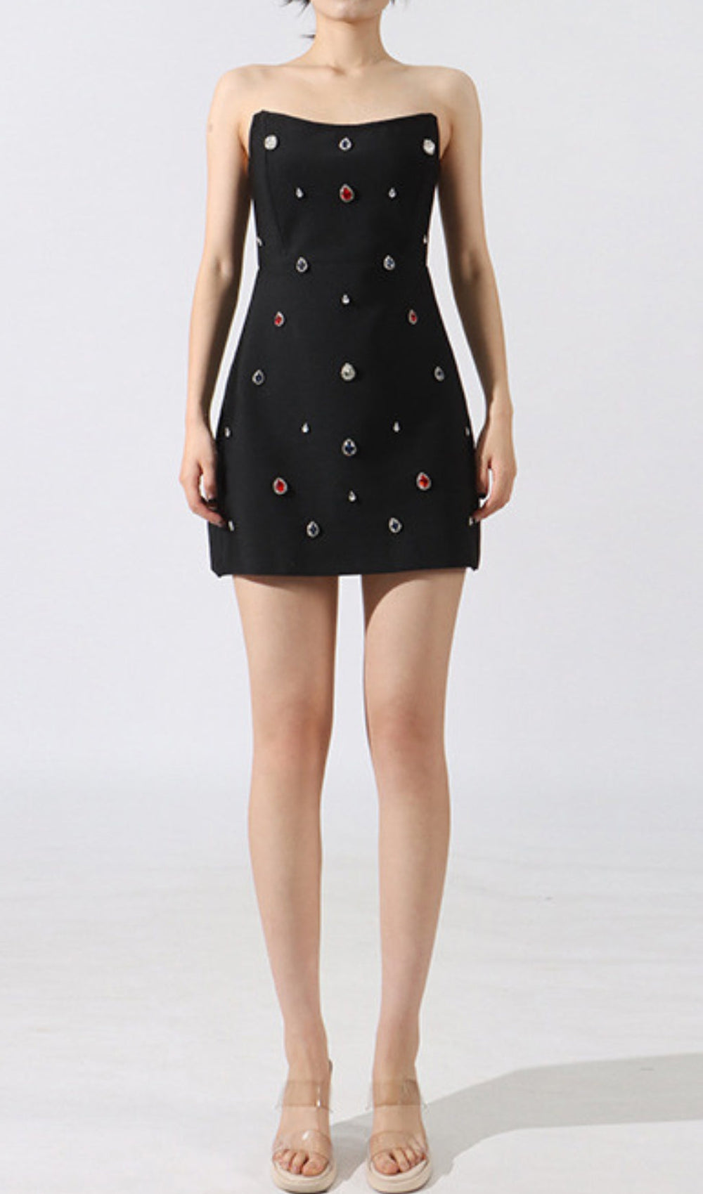Prepare to turn heads and capture every gaze with the Elvi Black Strapless Gemstone Mini Dress. This show-stopping piece is designed for the modern woman who loves to make a glamorous statement. Crafted in a timeless black fabric. its elegant strapless silhouette creates a flattering and confident look. while the scattered. shimmering multi-color gemstones (think brilliant clear crystals. fiery ruby reds. and deep sapphire blues) truly bring this dress to life. making you sparkle with every move.