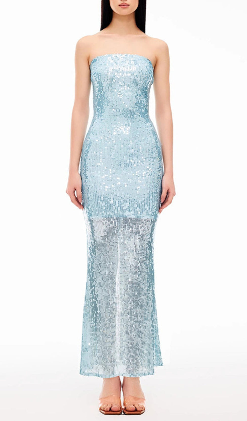 Adorned from top to bottom in shimmering sky-blue sequins. this dress promises to catch the light beautifully with every movement. Its alluring strapless design gracefully highlights your colletage and shoulders. while the figure-flattering silhouette elegantly skims your curves. leading to a sophisticated maxi length that boasts a hint of modern allure with its subtle. gorgeous sheer effect at the lower hem.