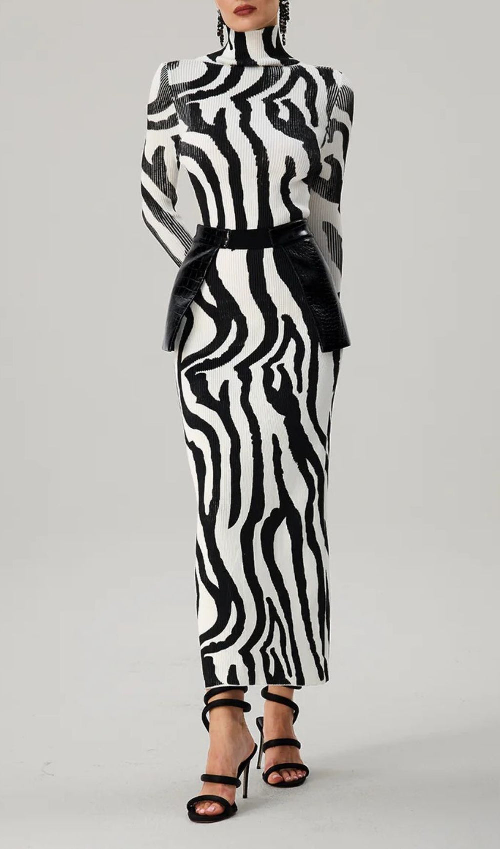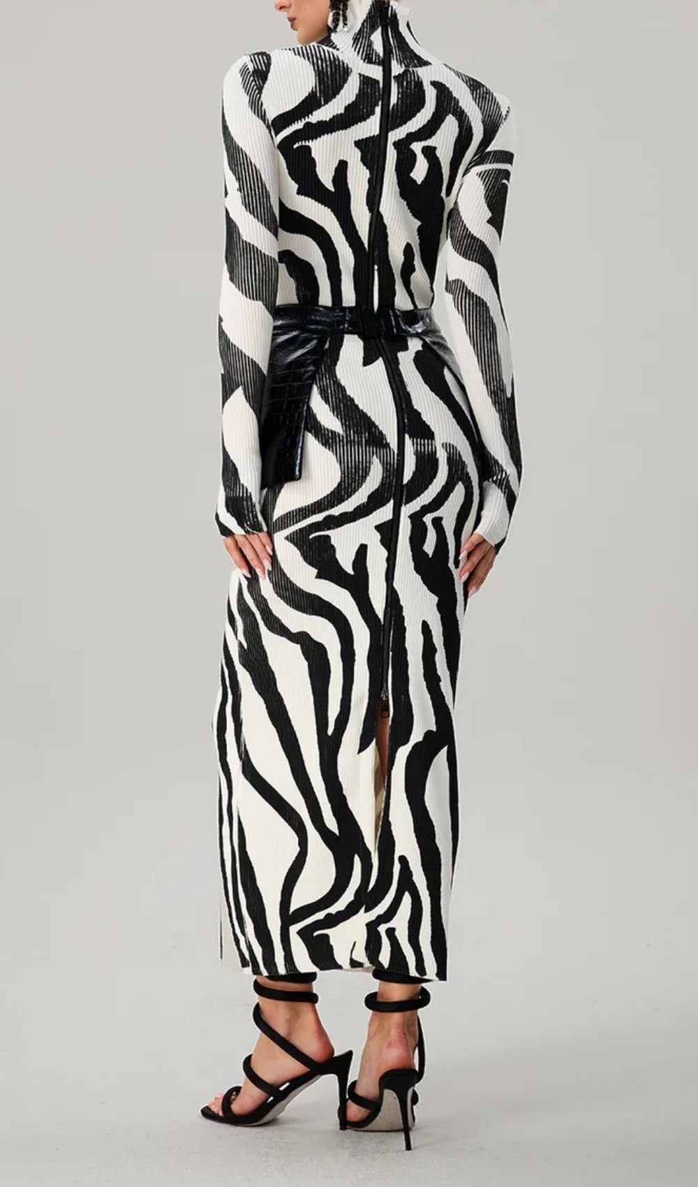 Embrace the power of print with a captivating. high-contrast zebra pattern that flows seamlessly from the sleek high-neck collar down to the floor-skimming hem. The body-conscious silhouette beautifully accentuates your curves. offering a flattering and confident fit. Its long sleeves add a touch of sophistication. making this more than just a dress—it's a wearable piece of art designed to express your bold personality.