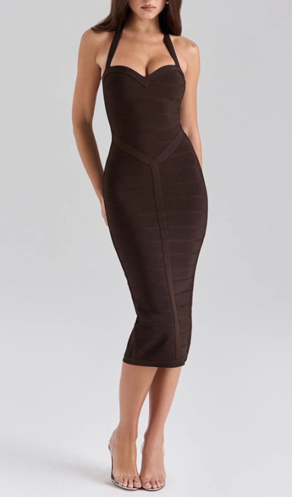 Step into the spotlight with the breathtaking Garry Coffee Halter Bandage Midi Dress. a true masterpiece of modern glamour designed to empower and captivate. Crafted in a luxurious. rich coffee hue. this dress isn't just an outfit—it's an experience. Its figure-hugging silhouette is meticulously engineered with strategic bandage detailing that expertly sculpts. lifts. and defines your curves. giving you that coveted "runway ready" look with absolute confidence.
