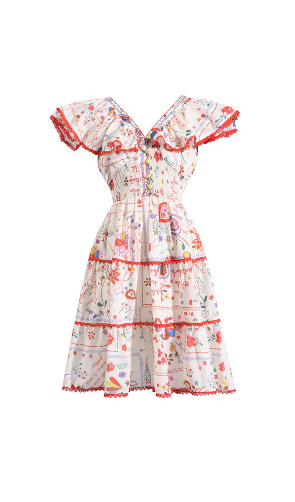 Designed with your comfort and confidence in mind. the Gelsey Mini Dress features a universally flattering V-neckline and chic ruffled flutter sleeves that add a touch of romantic appeal. Its relaxed. tiered silhouette creates beautiful movement. while the smocked waist accentuates your figure without compromising on comfort. ensuring you feel as good as you look.