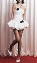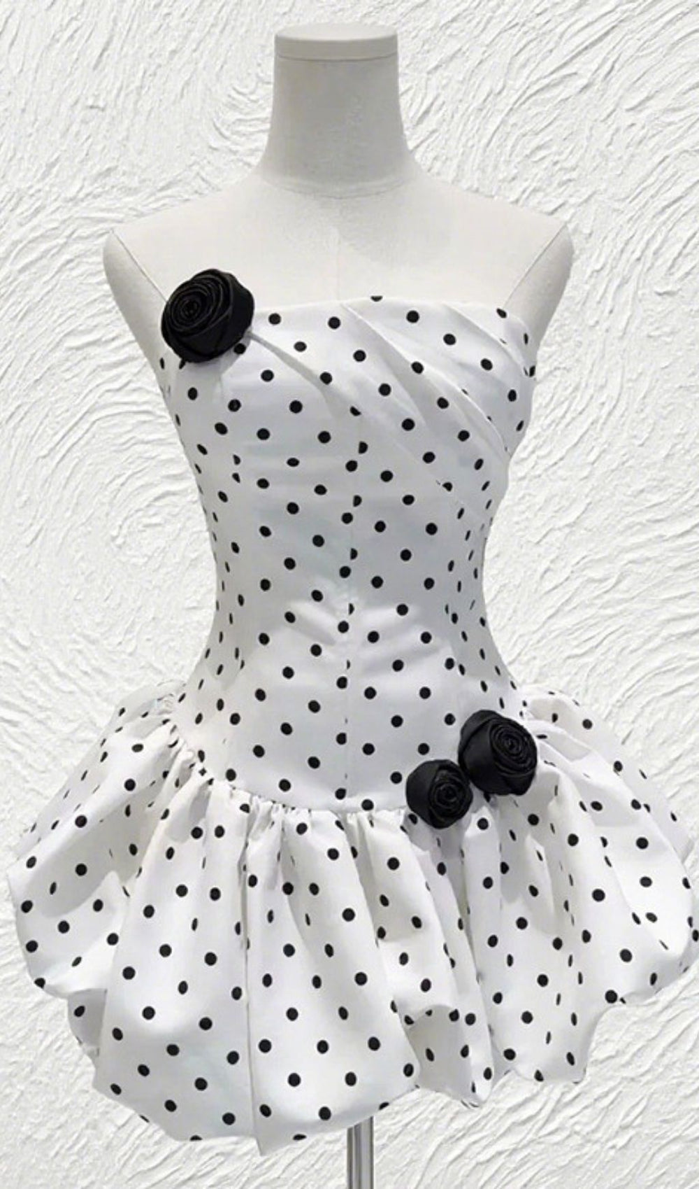 Adorned with an eye-catching array of classic black polka dots against crisp white fabric. this dress exudes a retro-chic vibe. The flattering strapless neckline beautifully highlights your colletage. while the charming black floral appliqués add a touch of romantic elegance to both the bust and the whimsical. voluminous skirt. Its expertly tailored silhouette ensures a comfortable yet figure-flattering fit.