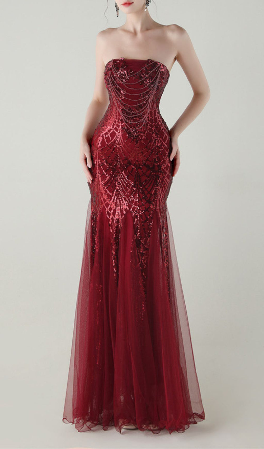 Step into the spotlight and command attention with the Ikuye Radiant Red Strapless Sequin Mermaid Gown. Designed for the woman who owns every room she enters. this breathtaking maxi dress masterfully fuses opulent sparkle with sophisticated design. From the intricate sequin artistry to the delicate mesh mermaid hem. every detail is crafted to ensure you're not just seen. but remembered.