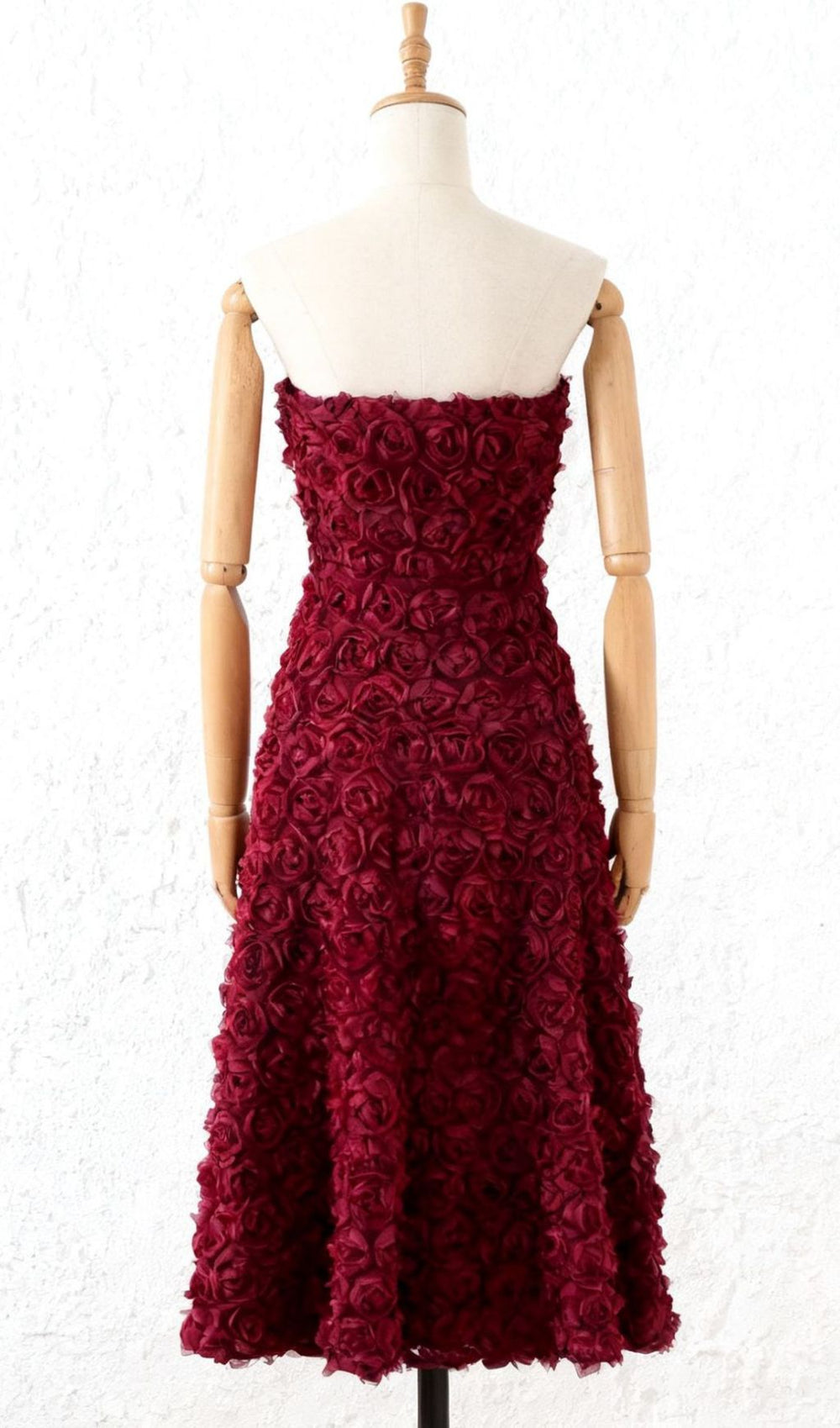 Step into a world of sophisticated allure with the Ikuyo Wine Strapless Rose Midi Dress. This breathtaking gown is a masterpiece of design. blending a deep. luxurious wine hue with an intricate tapestry of three-dimensional floral appliques that cover every inch of the fabric. The elegant strapless neckline highlights your colletage. creating a silhouette that is both timeless and captivating.